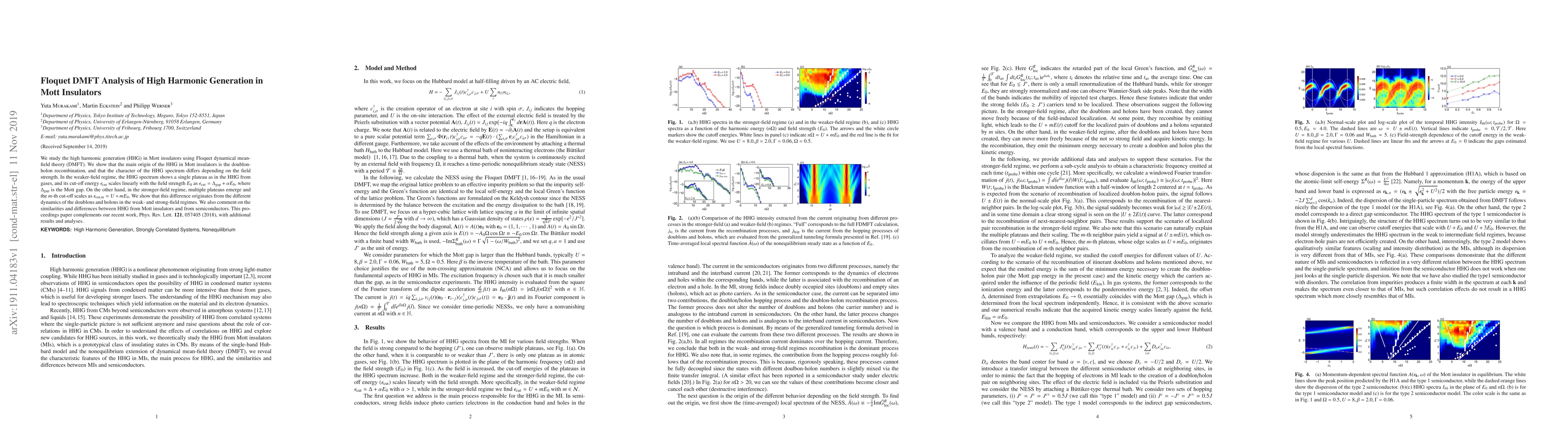 We study the high harmonic generation (HHG) in Mott insulators using Floquet dynamical mean-field theory (DMFT). We show that the main origin of the HHG in Mott insulators is the doublon-holon recombination, and that the character of the HHG spectrum differs depending on the field strength. In the weaker-field regime, the HHG spectrum shows a single plateau as in the HHG from gases, and its cut-off energy $\epsilon_{\rm cut}$ scales linearly with the field strength $E_0$ as $\epsilon_{\rm cut}=\Delta_{\rm gap} + \alpha E_0$, where $\Delta_{\rm gap}$ is the Mott gap. On the other hand, in the stronger-field regime, multiple plateaus emerge and the $m$-th cut-off scales as $\epsilon_{\rm cut,m}=U + m E_0$. We show that this difference originates from the different dynamics of the doublons and holons in the weak- and strong-field regimes. We also comment on the similarities and differences between HHG from Mott insulators and from semiconductors. This proceedings paper complements our recent work, Phys. Rev. Lett. 121, 057405 (2018), with additional results and analyses.