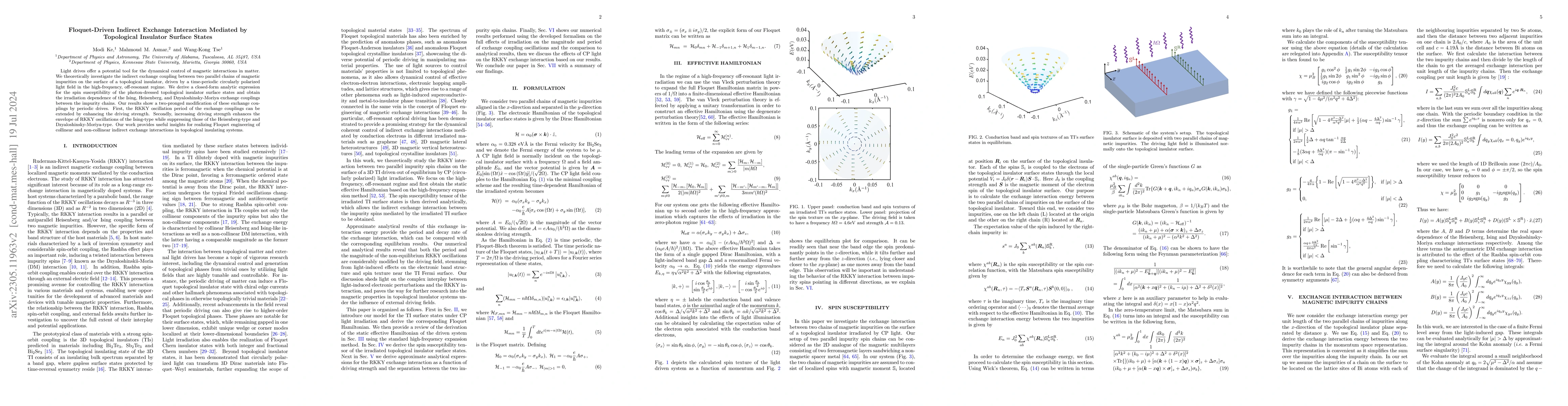 This paper investigates the indirect exchange interactions between magnetic impurities on a topological insulator's surface, driven by a high-frequency circularly polarized light field. The study reveals that periodic light drives can extend the oscillation period and modify the strength of different exchange coupling types, offering insights for controlling magnetic interactions in topological systems.