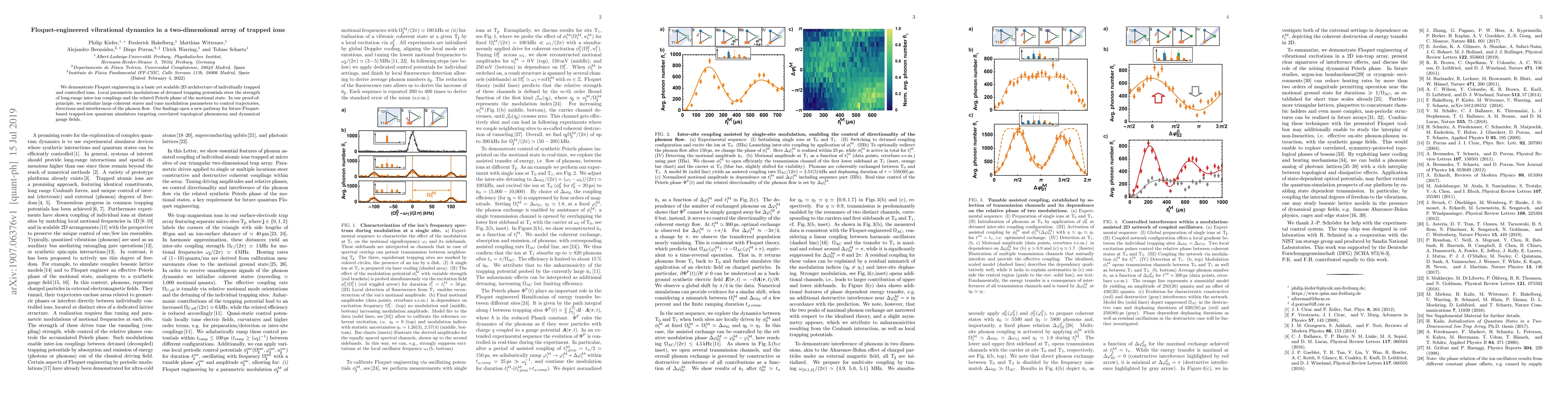We demonstrate Floquet engineering in a basic yet scalable 2D architecture of individually trapped and controlled ions. Local parametric modulations of detuned trapping potentials steer the strength of long-range inter-ion couplings and the related Peierls phase of the motional state. In our proof-of-principle, we initialize large coherent states and tune modulation parameters to control trajectories, directions and interferences of the phonon flow. Our findings open a new pathway for future Floquet-based trapped-ion quantum simulators targeting correlated topological phenomena and dynamical gauge fields.