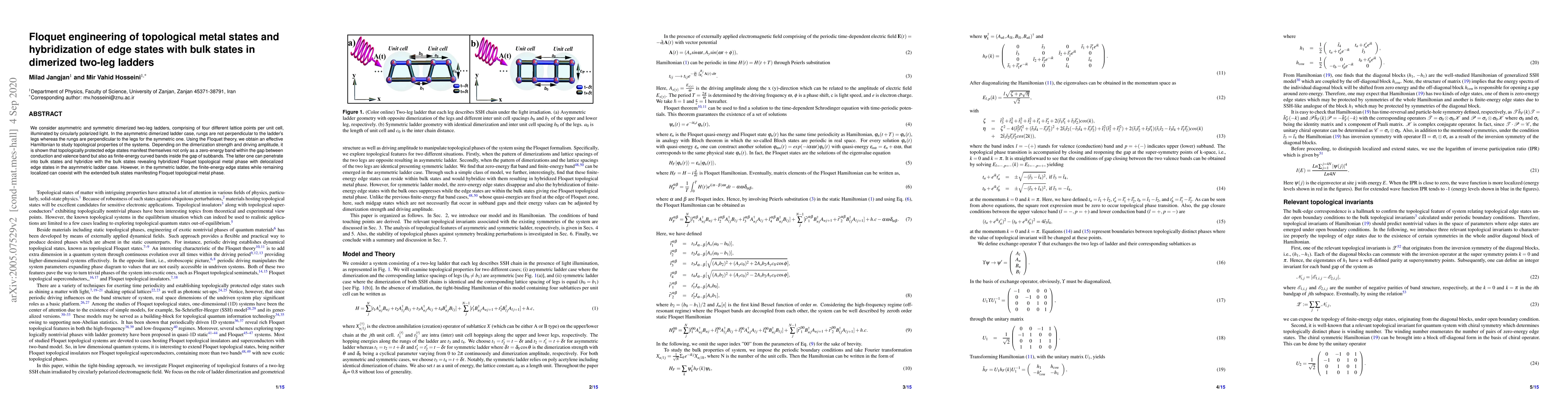 This paper explores the topological properties of dimerized two-leg ladders under circularly polarized light using Floquet theory, revealing that asymmetric ladders exhibit hybridized Floquet topological metal phases with delocalized edge states, while symmetric ladders show localized finite-energy edge states coexisting with extended bulk states.