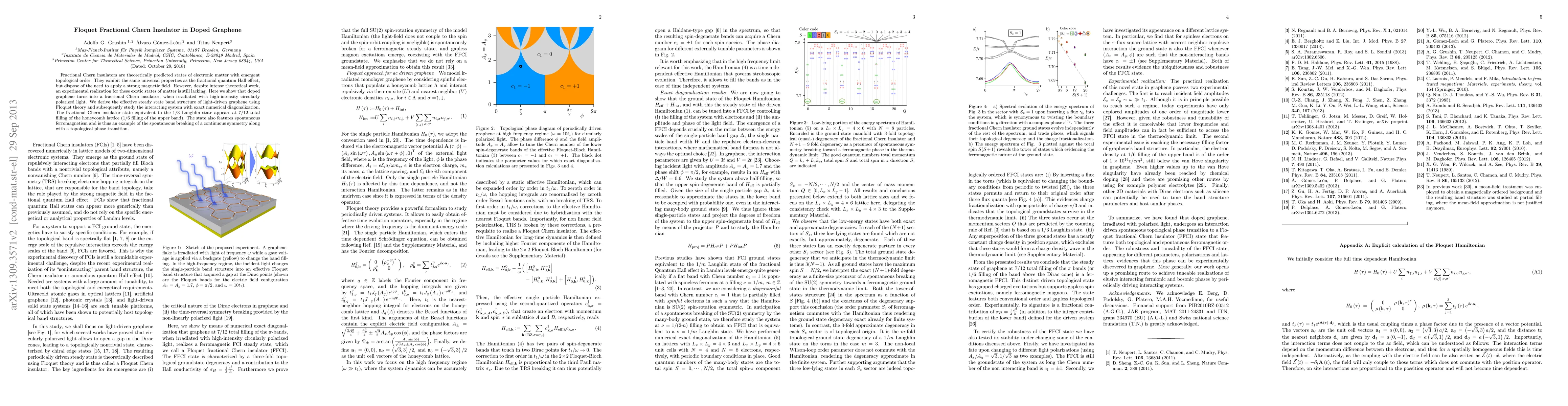 This paper demonstrates that doped graphene can function as a fractional Chern insulator when exposed to high-intensity circularly polarized light, revealing a 1/3 Laughlin state equivalent at 7/12 total filling. The study employs Floquet theory to derive the effective band structure and exact numerical methods to confirm the spontaneous ferromagnetism and topological phase transition.