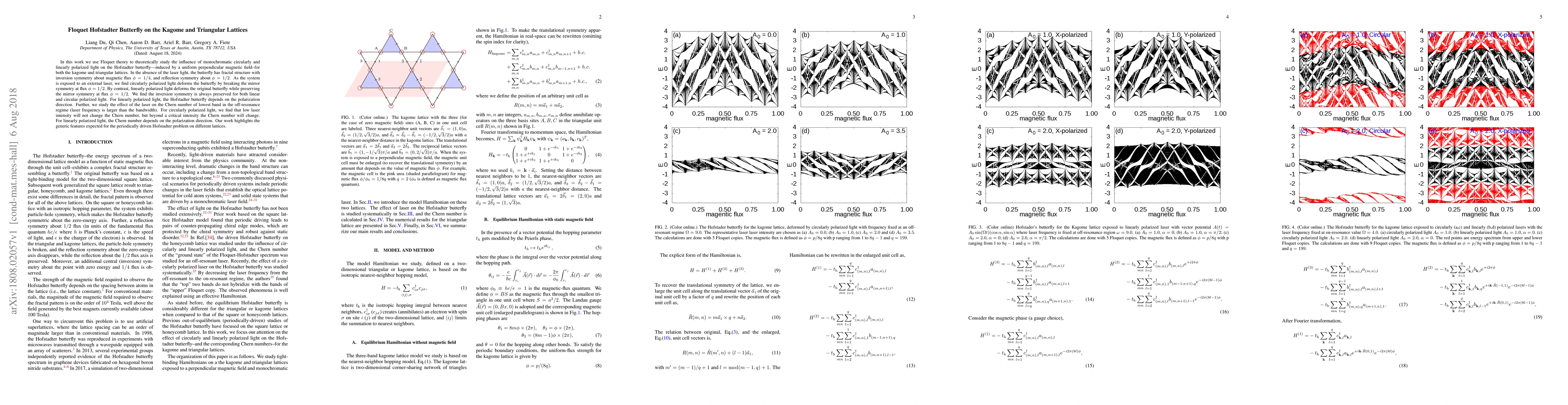 This paper investigates the impact of monochromatic circularly and linearly polarized light on the Hofstadter butterfly in kagome and triangular lattices using Floquet theory. Circularly polarized light breaks mirror symmetry at $\phi=1/2$, while linearly polarized light preserves it but depends on polarization direction, affecting the Chern number differently based on the light's intensity and polarization.