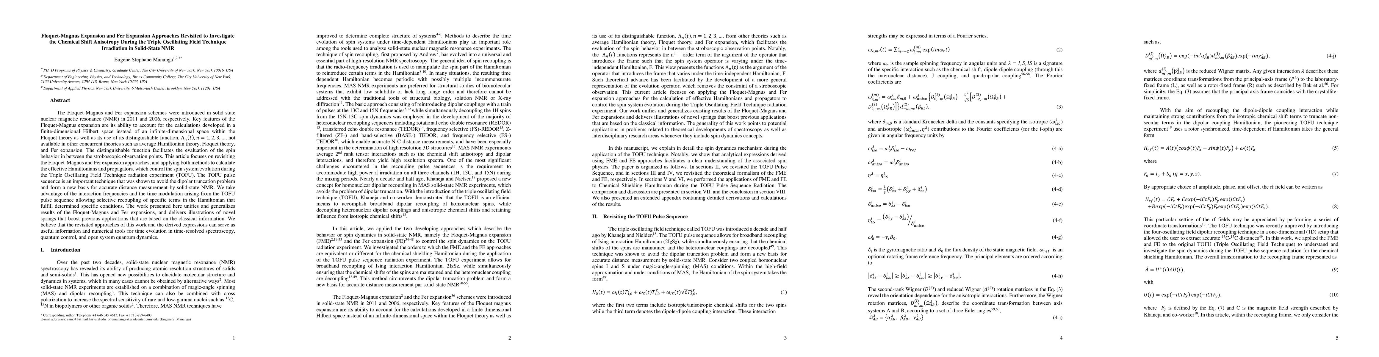 The Floquet-Magnus and Fer expansion schemes were introduced in solid-state nuclear magnetic resonance (NMR) in 2011 and 2006, respectively. Key features of the Floquet magnus expansion are its ability to account for the calculations developed in a finite-dimensional Hilbert space instead of an infinite-dimensional space within the Floquet theory as well as its use of its distinguishable function from other theories such as average Hamiltonian theory, Floquet theory, and Fer expansion, which facilitates the evaluation of the spin behavior in between the stroboscopic observation points. This article focuses on revisiting the Floquet-Magnus and Fer expansion approaches and applying both methods to calculate the effective Hamiltonians and propagators, which control the spin system evolution during the Triple Oscillating Field Technique radiation experiment (TOFU). The TOFU pulse sequence is an important technique that was shown to avoid the dipolar truncation problem and form a new basis for accurate distance measurement by solid-state NMR. We take advantage of the interaction frequencies and the time modulation arising from the TOFU pulse sequence allowing selective recoupling of specific terms in the Hamiltonian that fulfill determined specific conditions. The work presented unifies and generalizes existing results of the Floquet-Magnus and Fer expansions and delivers illustrations of novel springs that boost previous applications that are based on the classical information. We believe that the revisited approaches of this work and the derived expressions can serve as useful information and numerical tools for time evolution in time-resolved spectroscopy, quantum control, and open system quantum dynamics.