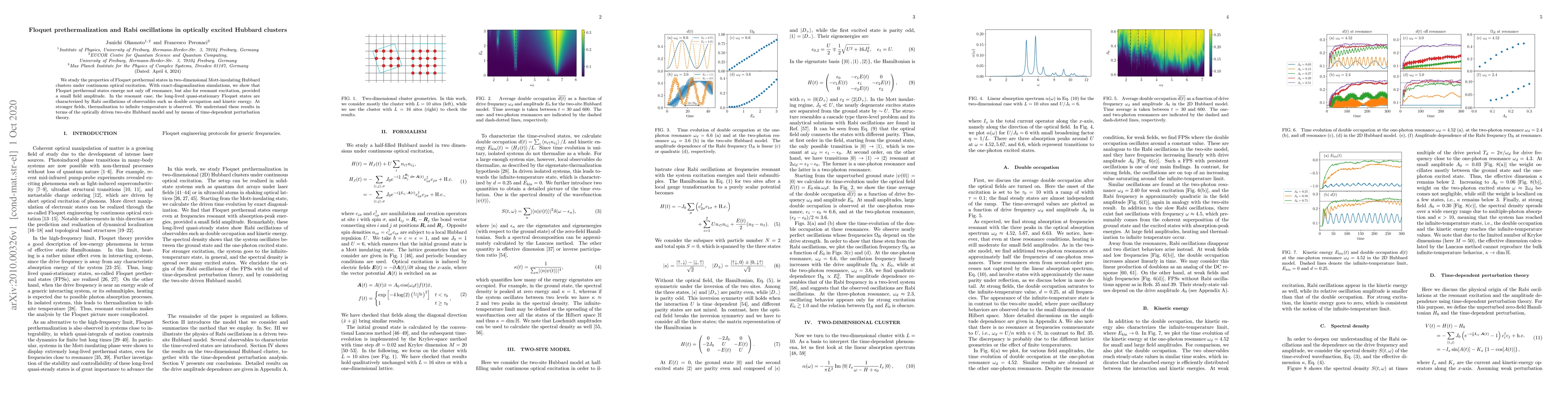This research explores Floquet prethermal states in two-dimensional Mott-insulating Hubbard clusters under continuous optical excitation. Utilizing exact-diagonalization simulations, it demonstrates the existence of these long-lived quasi-stationary Floquet states even under resonant excitation with small field amplitude, marked by Rabi oscillations in observables. Thermalization to infinite temperature is observed at stronger fields, understood via the optically driven two-site Hubbard model and time-dependent perturbation theory.