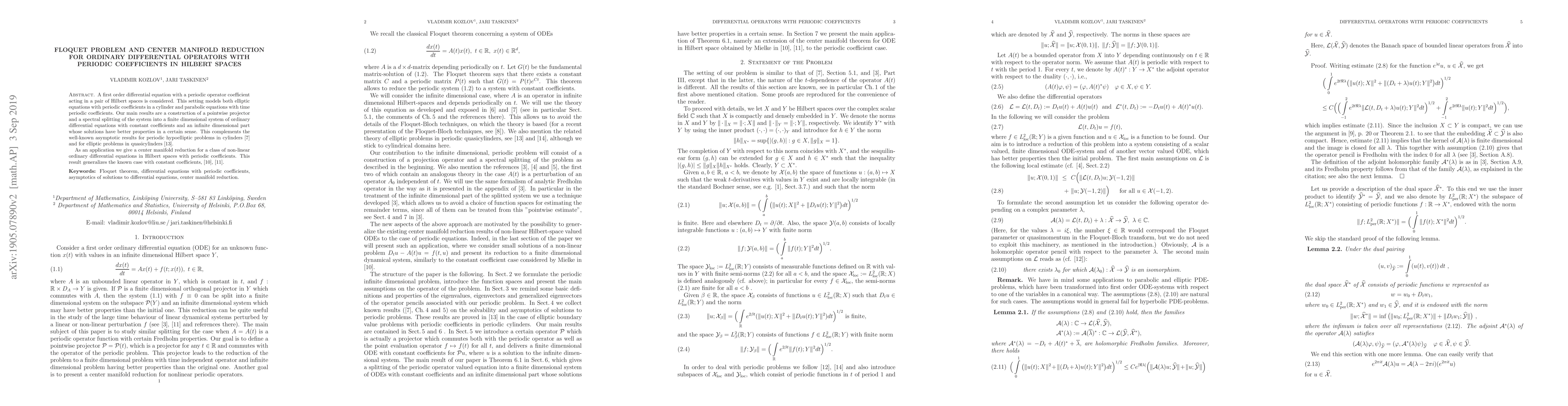 This paper constructs a pointwise projector and spectrally splits a first-order differential equation with periodic coefficients into a finite-dimensional system and an infinite-dimensional part, improving solution properties. It also extends center manifold reduction to non-linear ODEs in Hilbert spaces with periodic coefficients.