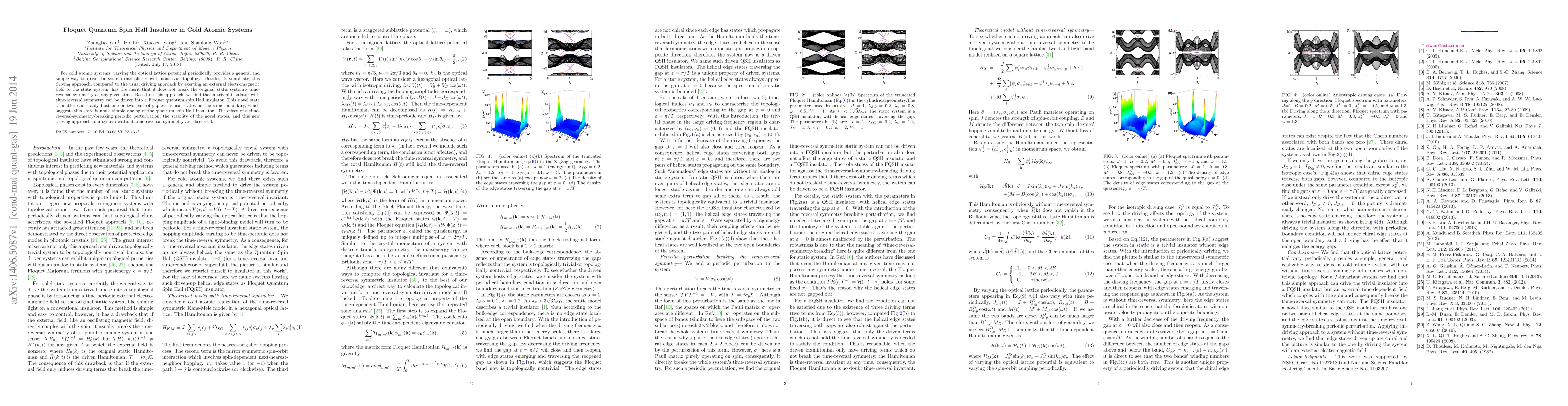 This paper explores the creation of a Floquet quantum spin Hall insulator in cold atomic systems by periodically varying the optical lattice potential, which maintains time-reversal symmetry. This approach results in a novel topological state hosting unique gapless helical states, differing from conventional quantum spin Hall insulators.