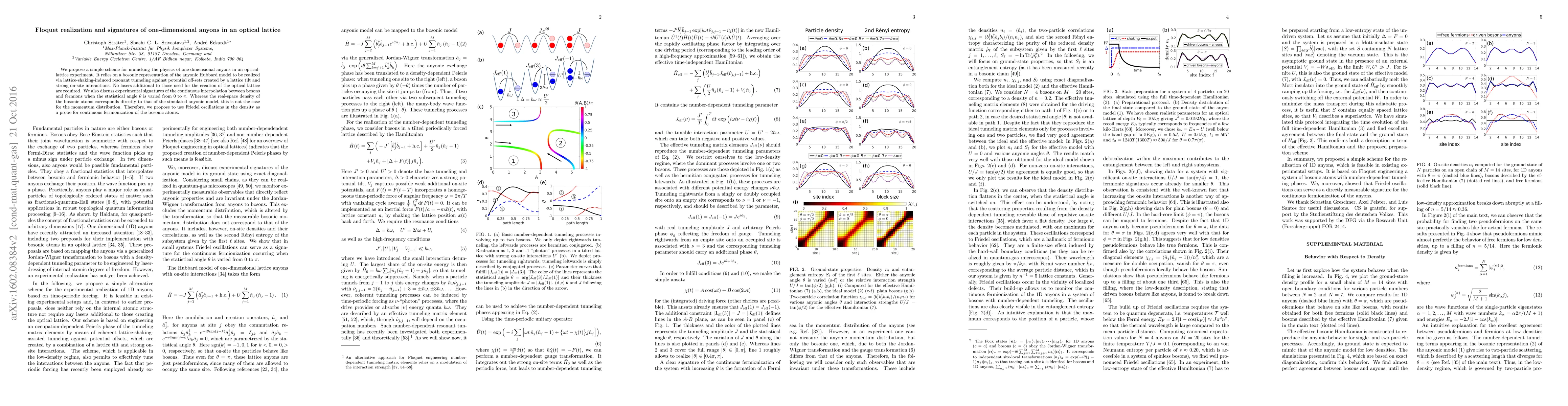 We propose a simple scheme for realizing the physics of 1D anyons with ultracold bosonic atoms in an optical lattice. It relies on lattice-shaking-induced resonant tunneling against potential off-sets created by a combination of a lattice tilt and strong on-site interactions. No lasers additional to those used for the creation of the optical lattice are required. We also discuss experimental signatures of the continuous interpolation between bosons and fermions when the statistical angle $\theta$ is varied from 0 to $\pi$. Since the anyonic momentum distribution is not measurable in the bosonic representation of the anyon model, we propose to use Friedel oscillations in small systems as an alternative probe.