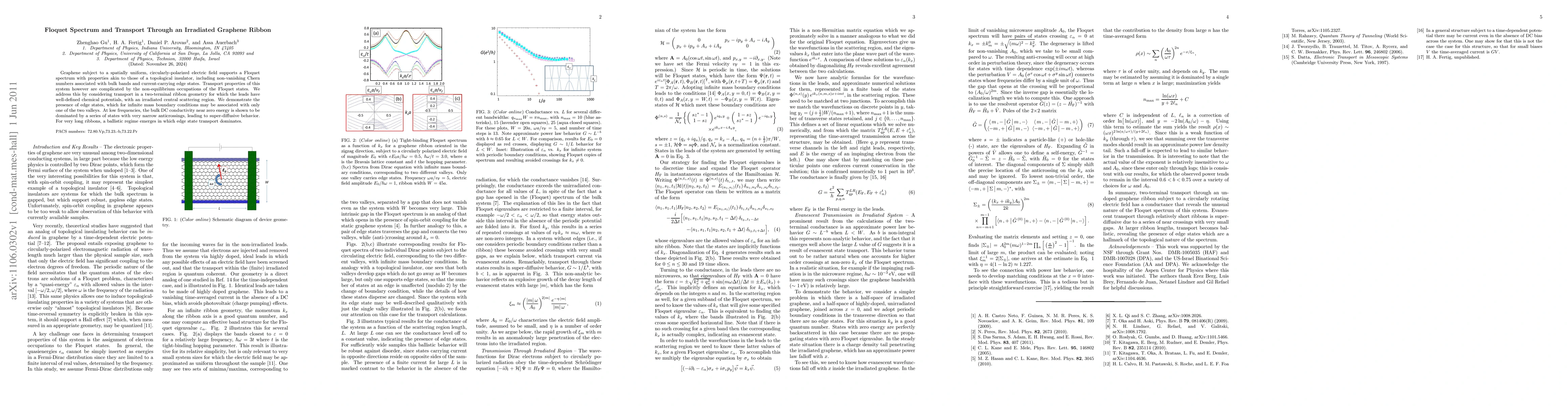 This paper investigates the transport properties of irradiated graphene ribbons under a circularly-polarized electric field, revealing a Floquet spectrum with topological insulator-like characteristics. It demonstrates super-diffusive behavior at low frequencies and a ballistic regime for long ribbons, dominated by edge state transport.