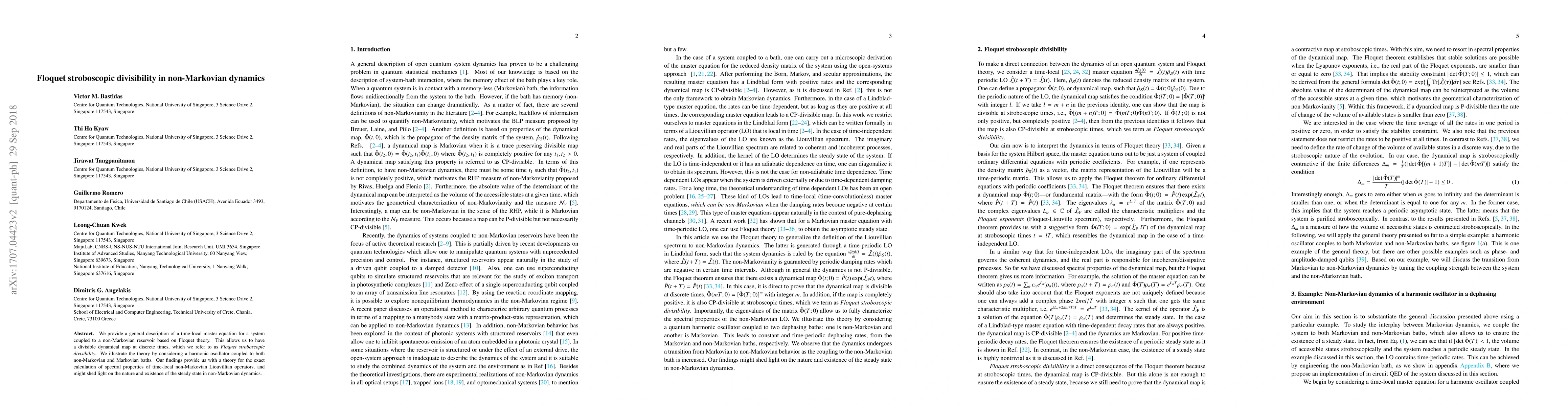 This paper explores the Liouvillian spectrum for systems coupled to non-Markovian baths using Floquet theory, revealing stroboscopic divisibility in dynamics with time-periodic rates. The authors demonstrate this concept with a Schrödinger cat example, showing stroboscopic revival, and suggest implications for entropy production in non-equilibrium systems.