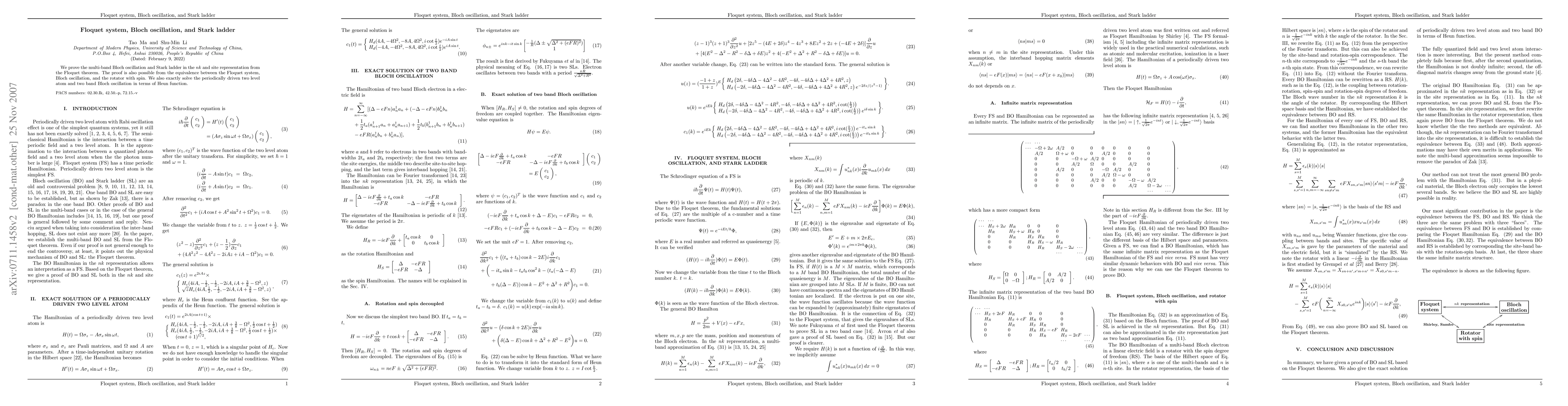 This paper proves the multi-band Bloch oscillation and Stark ladder phenomena using the Floquet theorem and demonstrates their equivalence to the rotator with spin. It also solves the periodically driven two-level atom and two-band Bloch oscillation using the Heun function.