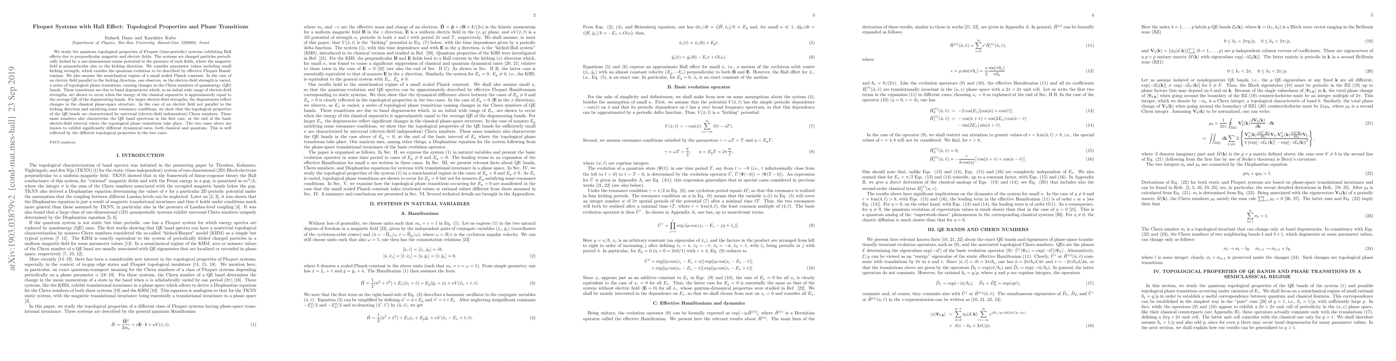 We study the quantum topological properties of Floquet (time-periodic) systems exhibiting Hall effects due to perpendicular magnetic and electric fields. The systems are charged particles periodically kicked by a one-dimensional cosine potential in the presence of such fields, where the magnetic field is perpendicular also to the kicking direction. We consider parameter values including small kicking strength, which enables the quantum evolution to be described by effective Floquet Hamiltonians. We also assume the semiclassical regime of a small scaled Planck constant. In the case of an electric field parallel to the kicking direction, one observes, as the electric-field strength is varied, a series of topological phase transitions, causing changes in the Chern numbers of quasienergy (QE) bands. These transitions are due to band degeneracies which, in an initial wide range of electric-field strengths, are shown to occur when the energy of the classical separatrix is approximately equal to the average QE of the degenerating bands. For larger electric-field strengths, the degeneracies reflect changes in the classical phase-space structure. In the case of an electric field not parallel to the kicking direction and satisfying some resonance conditions, we show that the topological properties of the QE bands are characterized by universal (electric-field independent) Chern numbers. These same numbers also characterize the QE band spectrum in the first case, at the end of the basic electric-field interval where the topological phase transitions take place. The two cases above are known to exhibit significantly different dynamical rates, both classical and quantum. This is well reflected by the different topological properties in the two cases.