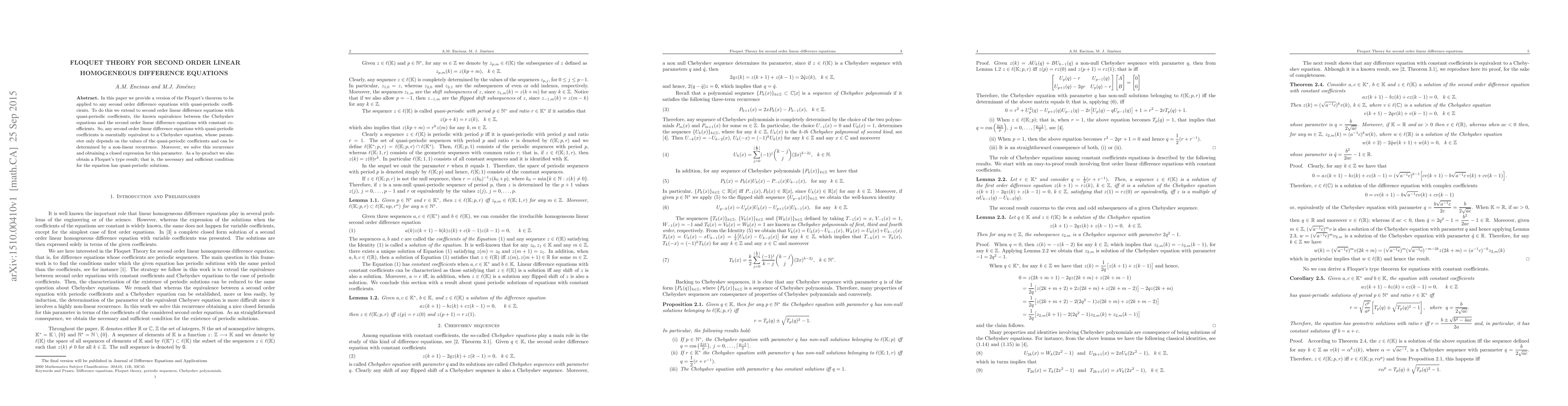 The paper extends Floquet theory to second-order linear homogeneous difference equations with quasi-periodic coefficients, establishing an equivalence with Chebyshev equations and deriving a closed expression for a parameter determining the periodicity.
