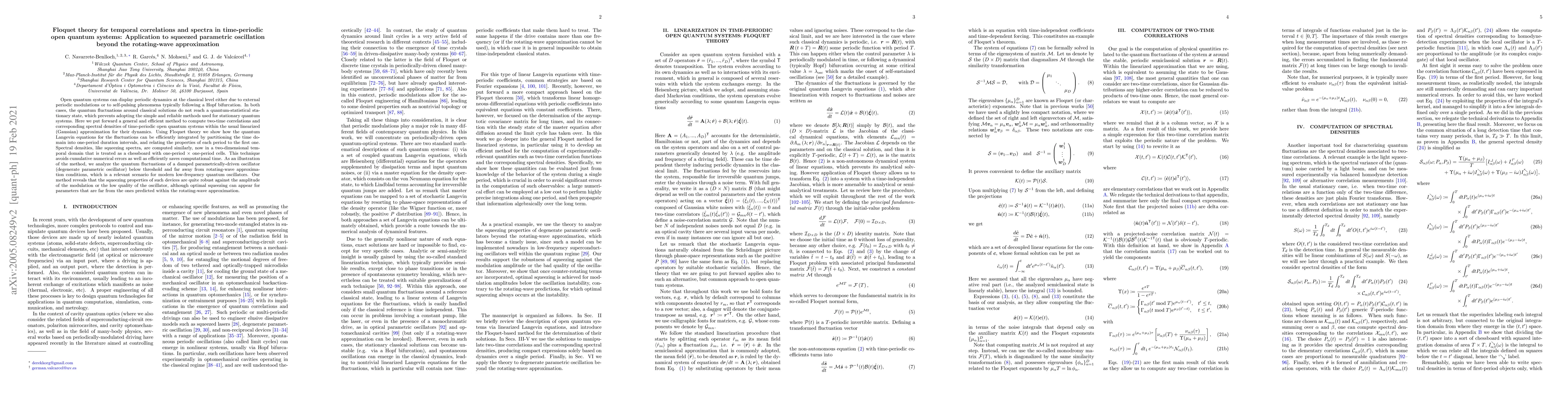 This paper introduces a method using Floquet theory to compute temporal correlations and spectra in open quantum systems with periodic dynamics, avoiding the limitations of the rotating-wave approximation. The technique efficiently integrates quantum Langevin equations and reveals robust squeezing properties in parametric oscillators.
