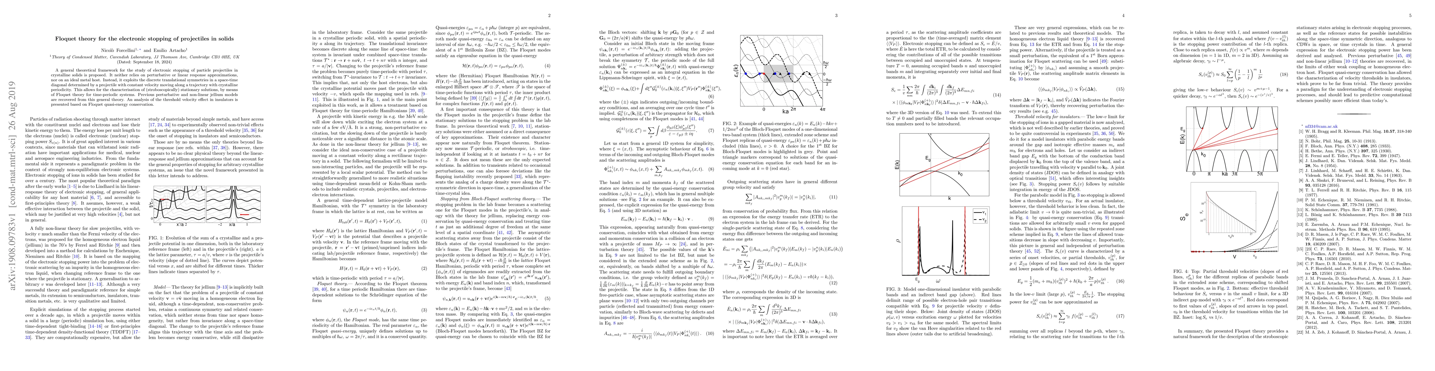 This paper proposes a novel theoretical framework using Floquet theory to study electronic stopping of projectiles in crystalline solids, avoiding perturbative or linear response approximations. It characterizes stationary solutions through time-periodic systems and recovers previous models, analyzing the threshold velocity effect in insulators.