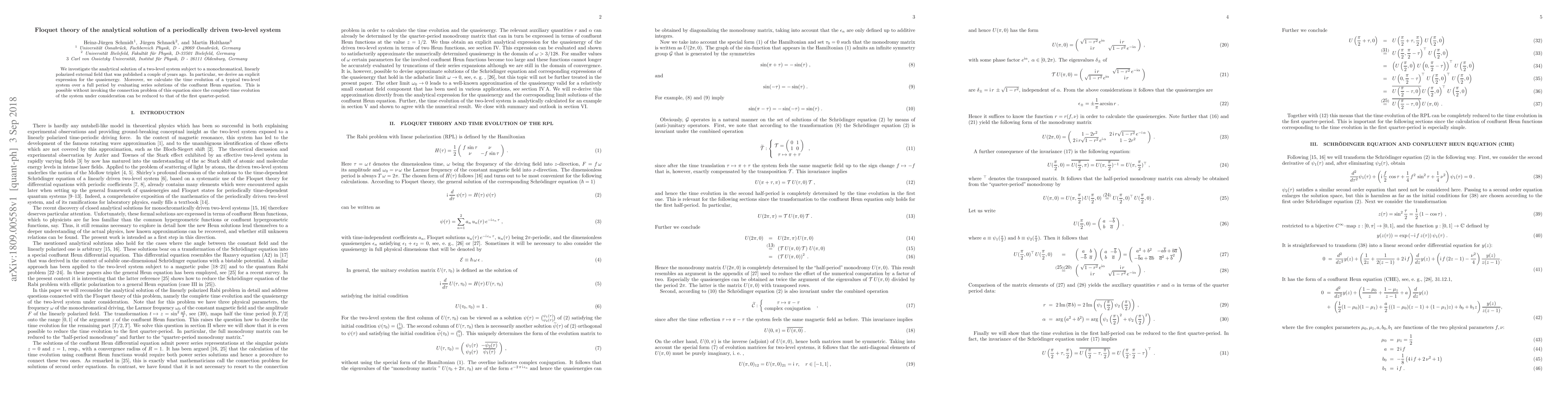We investigate the analytical solution of a two-level system subject to a monochromatical, linearly polarized external field that was published a couple of years ago. In particular, we derive an explicit expression for the quasienergy. Moreover, we calculate the time evolution of a typical two-level system over a full period by evaluating series solutions of the confluent Heun equation. This is possible without invoking the connection problem of this equation since the complete time evolution of the system under consideration can be reduced to that of the first quarter-period.