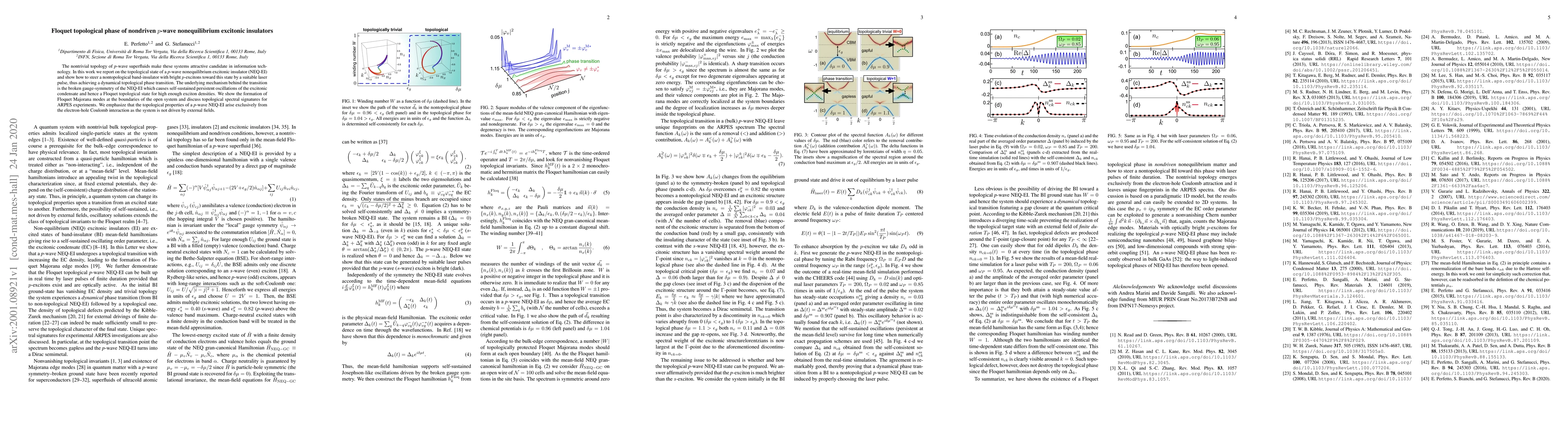 The nontrivial topology of {\it p}-wave superfluids make these systems attractive candidate in information technology. In this work we report on the topological state of a {\it p}-wave nonequilibrium excitonic insulator (NEQ-EI) and show how to steer a nontopological band-insulator with bright $p$-excitons toward this state by a suitable laser pulse, thus achieving a dynamical topological phase transition. The underlying mechanism behind the transition is the broken gauge-symmetry of the NEQ-EI which causes self-sustained persistent oscillations of the excitonic condensate and hence a Floquet topological state for high enough exciton densities. We show the formation of Floquet Majorana modes at the boundaries of the open system and discuss topological spectral signatures for ARPES experiments. We emphasize that the topological properties of a {\it p}-wave NEQ-EI arise exclusively from the electron-hole Coulomb interaction as the system is not driven by external fields.