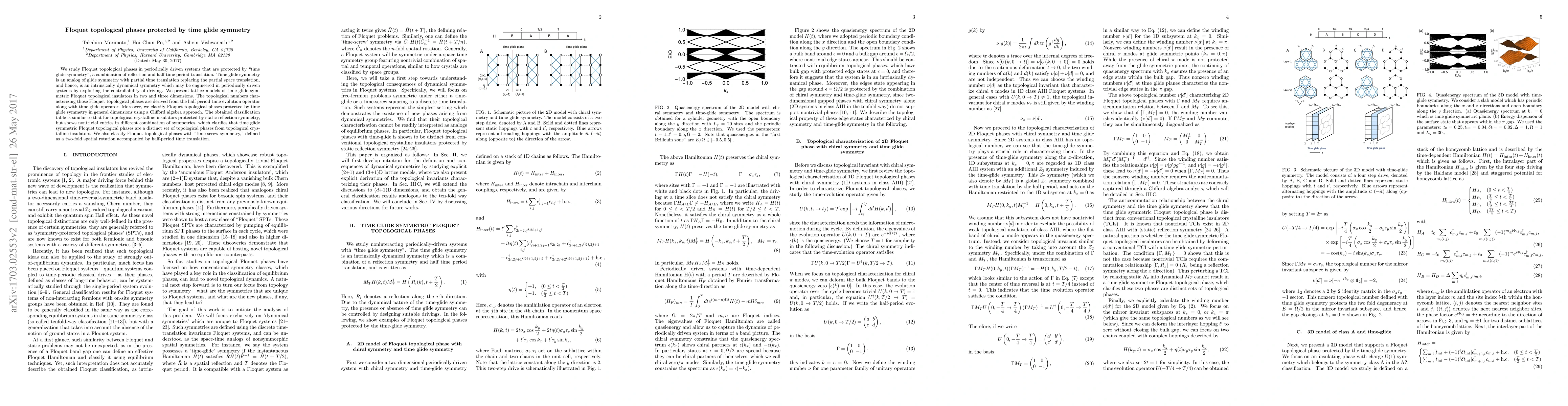 This paper investigates Floquet topological phases in periodically driven systems protected by "time glide symmetry," a combination of reflection and half-period translation. The study develops lattice models and classifies these phases using a Clifford algebra approach, distinguishing them from topological crystalline insulators.