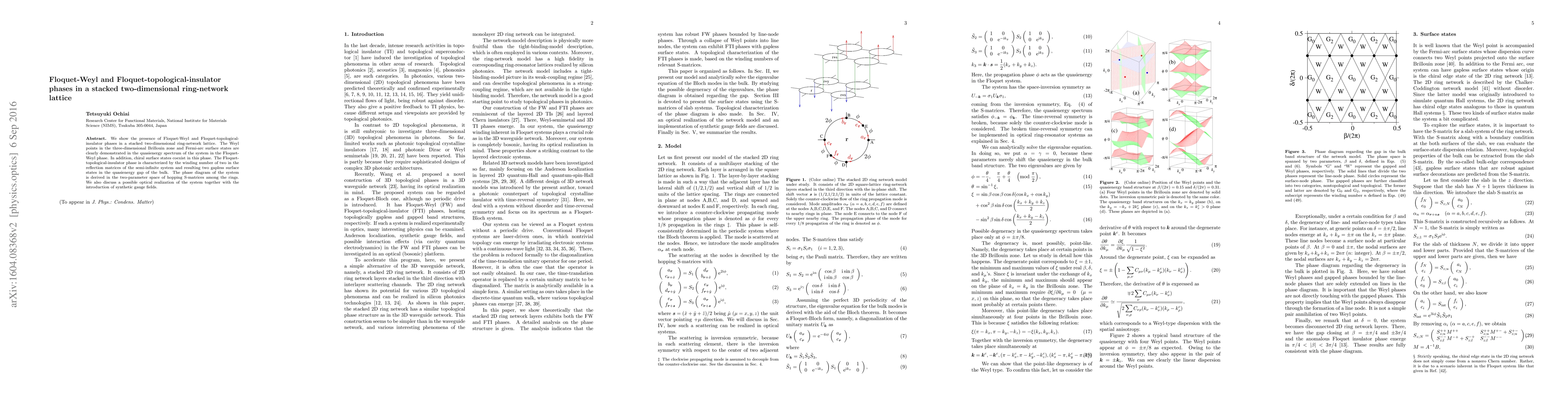 This paper demonstrates the existence of Floquet-Weyl and Floquet-topological-insulator phases in a stacked two-dimensional ring-network lattice, showing Weyl points and Fermi-arc surface states in the Weyl phase, and two gapless surface states in the topological insulator phase. The phase diagram is derived from hopping parameters, and potential optical realizations are discussed.