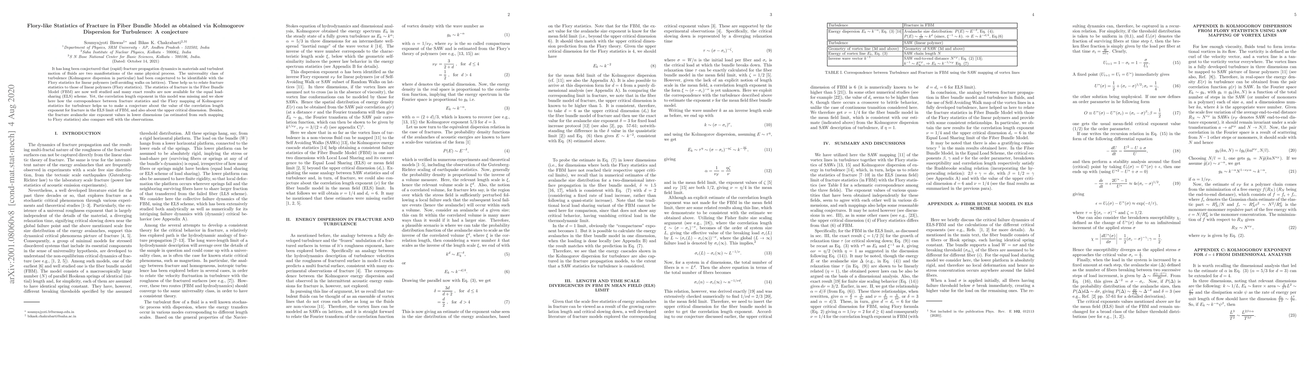 It has long been conjectured that (rapid) fracture propagation dynamics in materials and turbulent motion of fluids are two manifestations of the same physical process. The universality class of turbulence (Kolmogorov dispersion in particular) had been conjectured to be identifiable with the Flory statistics for linear polymers (self-avoiding walks on lattices). These help us to relate fracture statistics to those of linear polymers (Flory statistics). The statistics of fracture in the Fiber Bundle Model (FBM) are now well studied and many exact results are now available for the equal load-sharing (ELS) scheme. Yet, the correlation length exponent in this model was missing and we show here how the correspondence between fracture statistics and the Flory mapping of Kolmogorov statistics for turbulence helps us to make a conjecture about the value of the correlation length exponent for fracture in the ELS limit of FBM, and also about the upper critical dimension. Besides, the fracture avalanche size exponent values in lower dimensions (as estimated from such mapping to Flory statistics) also compare well with the observations.