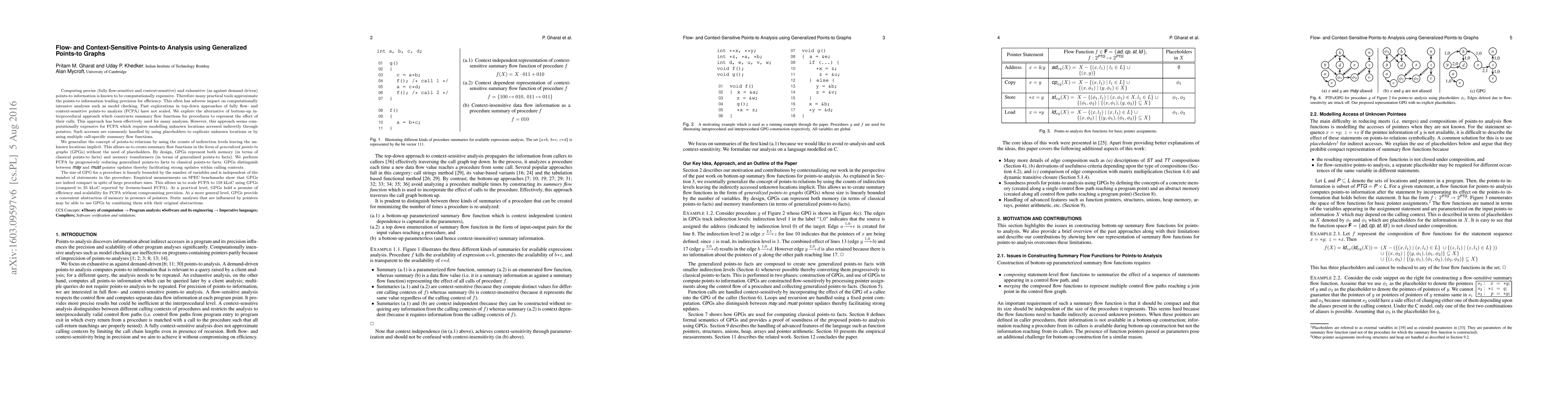 This paper proposes a bottom-up interprocedural approach using generalized points-to graphs (GPGs) to perform fully flow- and context-sensitive points-to analysis (FCPA) efficiently. GPGs represent memory and memory transformers without placeholders, enabling scalable FCPA for large codebases.