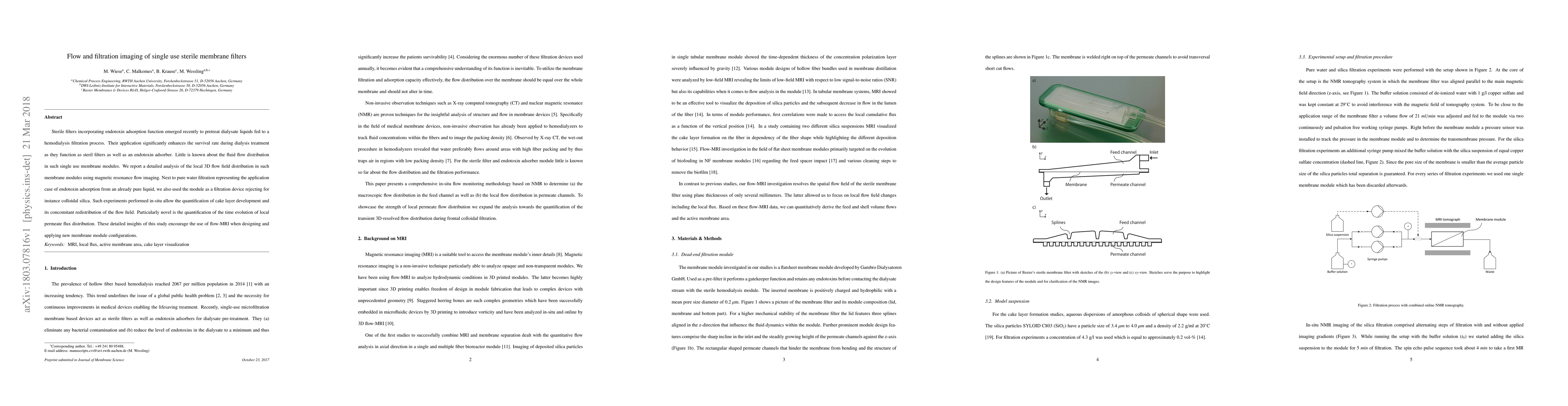This paper investigates the 3D flow field distribution in single-use sterile membrane filters using magnetic resonance flow imaging, revealing insights into fluid dynamics and cake layer development. The study highlights the potential of flow-MRI in optimizing membrane module designs and enhancing dialysis treatment efficacy.