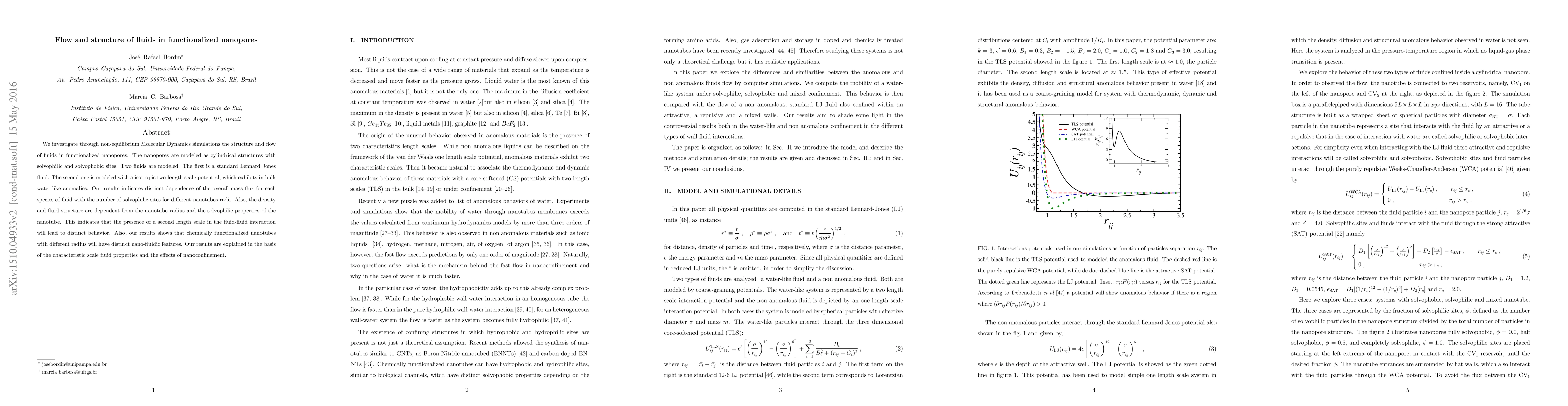We investigate through non-equilibrium Molecular Dynamics simulations the structure and flow of fluids in functionalized nanopores. The nanopores are modeled as cylindrical structures with solvophilic and solvophobic sites. Two fluids are modeled. The first is a standard Lennard Jones fluid. The second one is modeled with a isotropic two-length scale potential, which exhibits in bulk water-like anomalies. Our results indicates distinct dependence of the overall mass flux for each species of fluid with the number of solvophilic sites for different nanotubes radii. Also, the density and fluid structure are dependent from the nanotube radius and the solvophilic properties of the nanotube. This indicates that the presence of a second length scale in the fluid-fluid interaction will lead to distinct behavior. Also, our results shows that chemically functionalized nanotubes with different radius will have distinct nano-fluidic features. Our results are explained in the basis of the characteristic scale fluid properties and the effects of nanoconfinement.