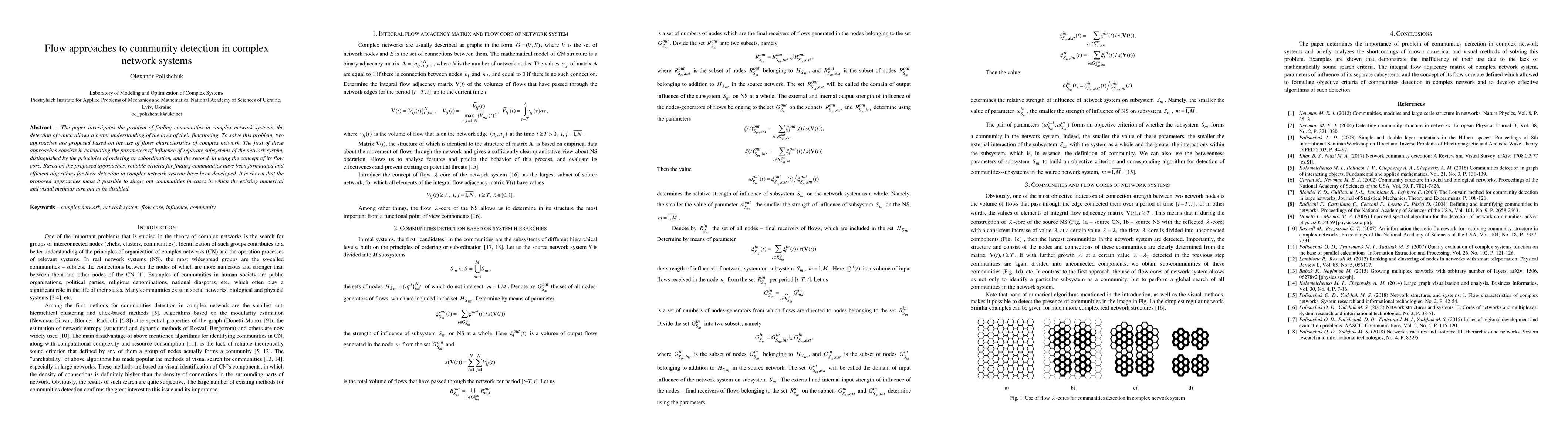 The paper investigates the problem of finding communities in complex network systems, the detection of which allows a better understanding of the laws of their functioning. To solve this problem, two approaches are proposed based on the use of flows characteristics of complex network. The first of these approaches consists in calculating the parameters of influence of separate subsystems of the network system, distinguished by the principles of ordering or subordination, and the second, in using the concept of its flow core. Based on the proposed approaches, reliable criteria for finding communities have been formulated and efficient algorithms for their detection in complex network systems have been developed. It is shown that the proposed approaches make it possible to single out communities in cases in which the existing numerical and visual methods turn out to be disabled.