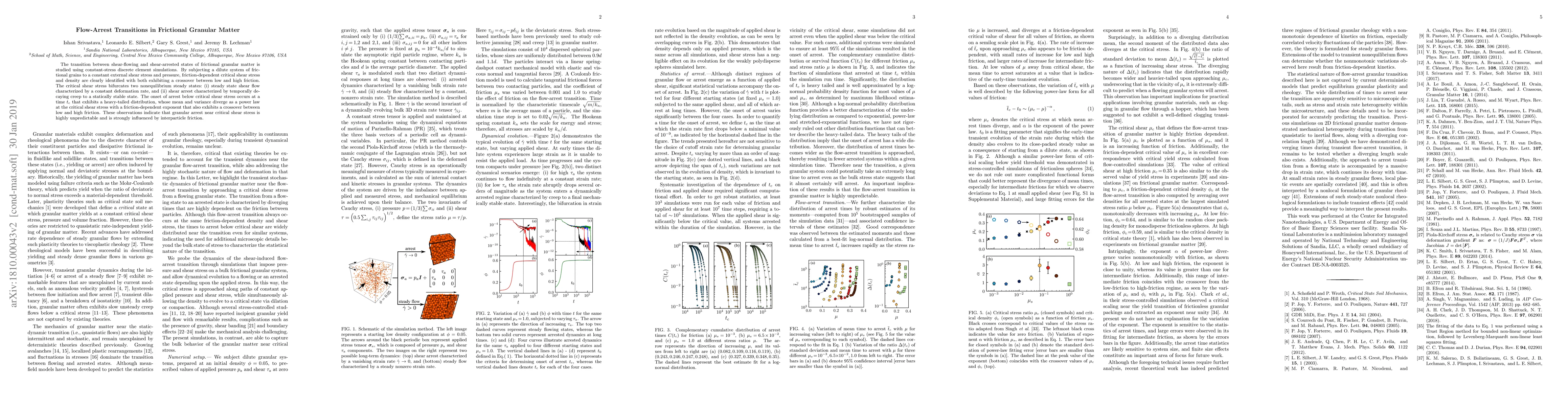This paper investigates the transition between flowing and arrested states in frictional granular matter using discrete element simulations. The study identifies friction-dependent critical shear stress and density, revealing a bifurcation into steady shear flow and shear arrest, with arrest onset time showing a heavy-tailed distribution influenced by interparticle friction.