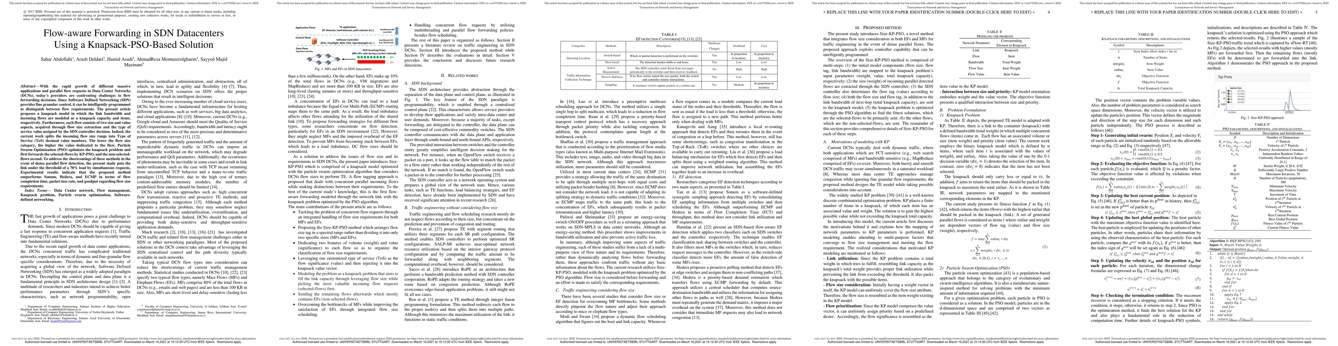 With the rapid growth of different massive applications and parallel flow requests in Data Center Networks (DCNs), today's providers are confronting challenges in flow forwarding decisions. Since Software Defined Networking (SDN) provides fine granular control, it can be intelligently programmed to distinguish between flow requirements. The present article proposes a knapsack model in which the link bandwidth and incoming flows are modeled as a knapsack capacity and items, respectively. Furthermore, each flow consists of two size and value aspects, acquired through flow size extraction and the type of service value assigned by the SDN controller decision. Indeed, the current work splits the incoming flow size range into Type of Service (ToS) decimal value numbers. The lower the flow size category, the higher the value dedicated to the flow. Particle Swarm Optimization (PSO) optimizes the knapsack problem and first forwards the selected flows by KP-PSO, and the non-selected-flows second. To address the shortcomings of these methods in the event of dense parallel flow detection, the present study puts the link under the threshold of a 70 percent load by simultaneous requests. Experimental results indicate that the proposed method outperforms Sonum, Hedera, and ECMP in terms of flow completion time, packet loss rate, and goodput regarding flow size requirements.