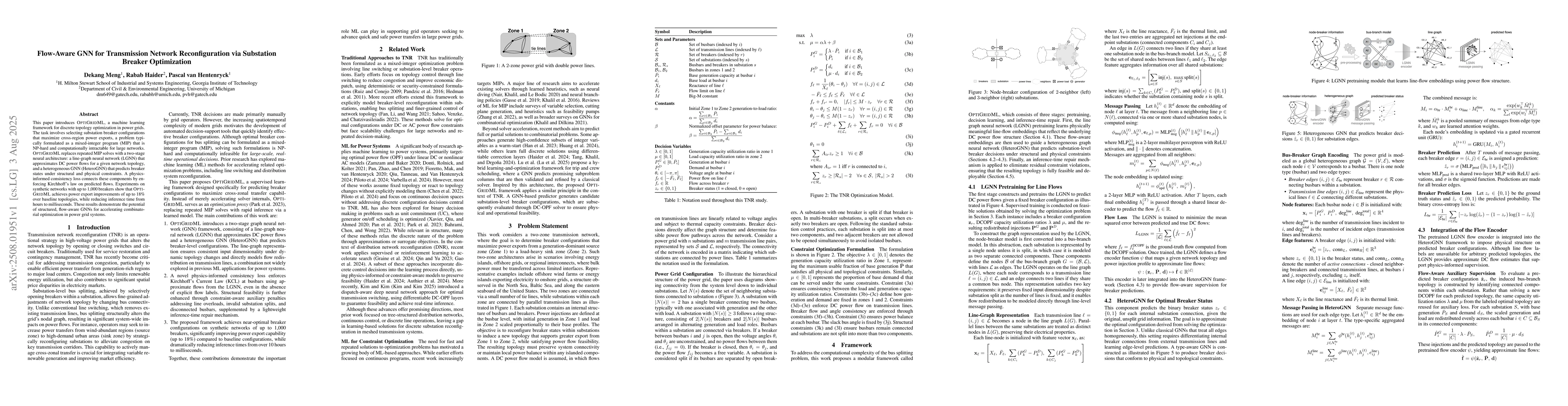 This paper introduces OptiGridML, a machine learning framework for discrete topology optimization in power grids. The task involves selecting substation breaker configurations that maximize cross-region power exports, a problem typically formulated as a mixed-integer program (MIP) that is NP-hard and computationally intractable for large networks. OptiGridML replaces repeated MIP solves with a two-stage neural architecture: a line-graph neural network (LGNN) that approximates DC power flows for a given network topology, and a heterogeneous GNN (HeteroGNN) that predicts breaker states under structural and physical constraints. A physics-informed consistency loss connects these components by enforcing Kirchhoff's law on predicted flows. Experiments on synthetic networks with up to 1,000 breakers show that OptiGridML achieves power export improvements of up to 18% over baseline topologies, while reducing inference time from hours to milliseconds. These results demonstrate the potential of structured, flow-aware GNNs for accelerating combinatorial optimization in physical networked systems.