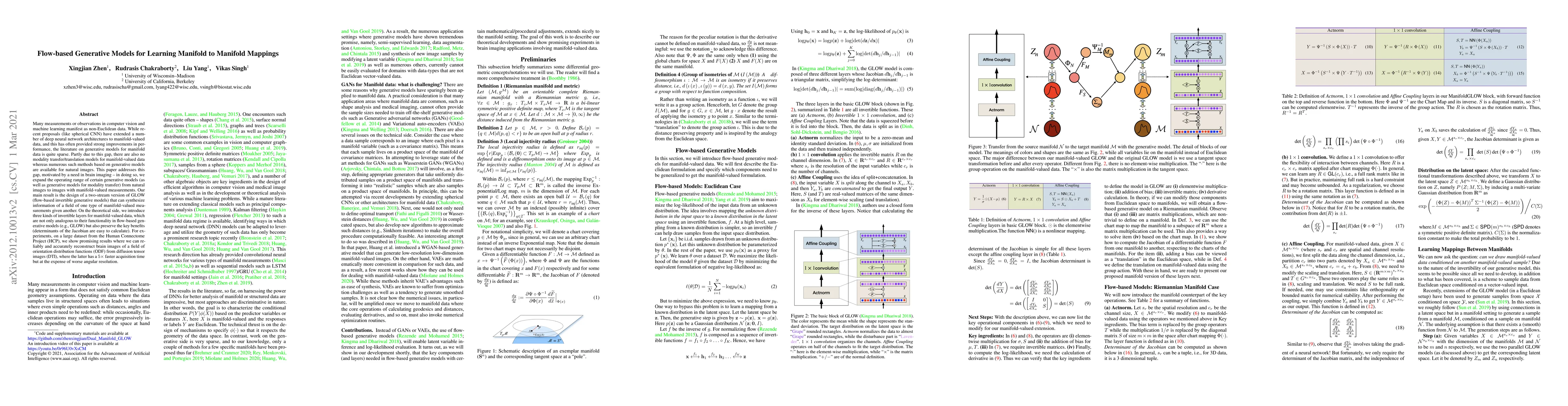 This paper develops a two-stream GLOW model for manifold-to-manifold mapping, specifically for brain imaging applications, addressing the lack of generative models for manifold data. The proposed model uses three types of invertible layers for manifold-valued data, enabling accurate reconstruction of orientation distribution functions from diffusion tensor images.