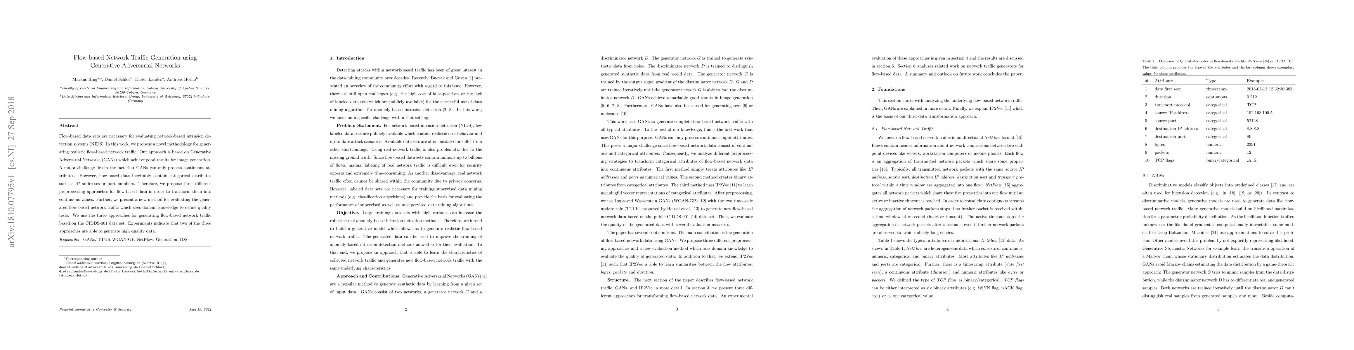 This research proposes a novel method for generating realistic flow-based network traffic using Generative Adversarial Networks (GANs), addressing the challenge of categorical attributes by preprocessing techniques. It introduces an evaluation method based on domain knowledge and demonstrates the effectiveness of two out of three proposed preprocessing approaches.