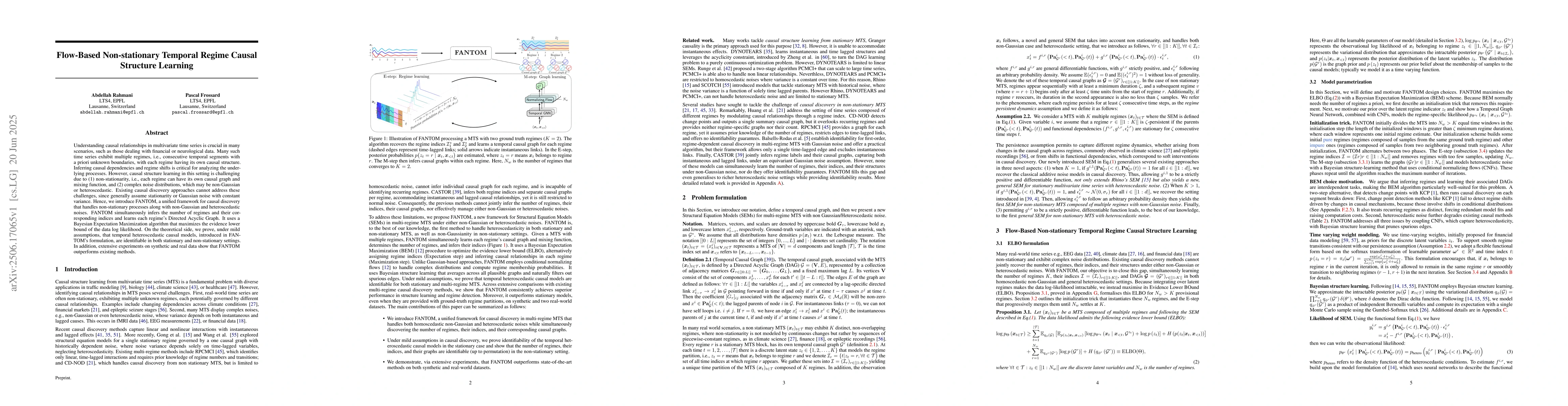 Understanding causal relationships in multivariate time series is crucial in many scenarios, such as those dealing with financial or neurological data. Many such time series exhibit multiple regimes, i.e., consecutive temporal segments with a priori unknown boundaries, with each regime having its own causal structure. Inferring causal dependencies and regime shifts is critical for analyzing the underlying processes. However, causal structure learning in this setting is challenging due to (1) non stationarity, i.e., each regime can have its own causal graph and mixing function, and (2) complex noise distributions, which may be non Gaussian or heteroscedastic. Existing causal discovery approaches cannot address these challenges, since generally assume stationarity or Gaussian noise with constant variance. Hence, we introduce FANTOM, a unified framework for causal discovery that handles non stationary processes along with non Gaussian and heteroscedastic noises. FANTOM simultaneously infers the number of regimes and their corresponding indices and learns each regime's Directed Acyclic Graph. It uses a Bayesian Expectation Maximization algorithm that maximizes the evidence lower bound of the data log likelihood. On the theoretical side, we prove, under mild assumptions, that temporal heteroscedastic causal models, introduced in FANTOM's formulation, are identifiable in both stationary and non stationary settings. In addition, extensive experiments on synthetic and real data show that FANTOM outperforms existing methods.