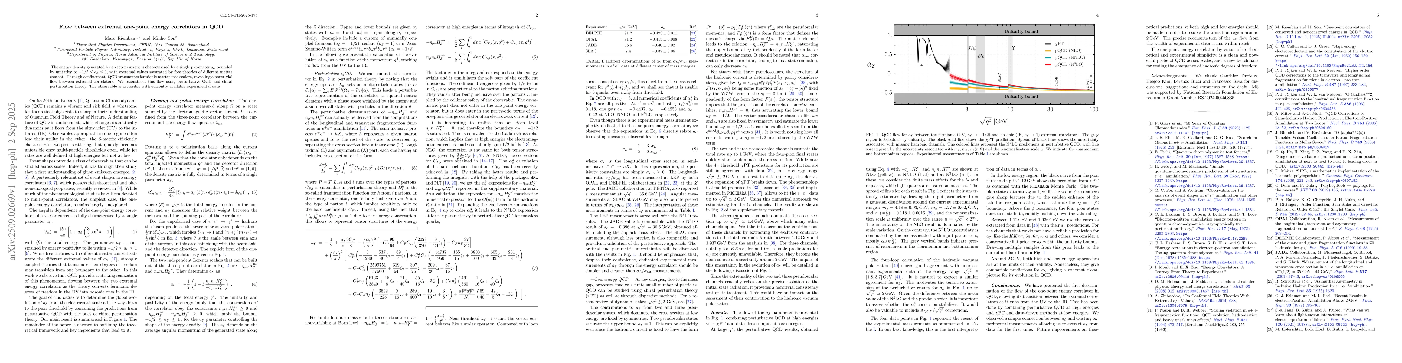 The energy density generated by a vector current is characterized by a single parameter $a_{\mathcal{E}}$ bounded by unitarity to $-1/2 \leq a_{\mathcal{E}} \leq 1$, with extremal values saturated by free theories of different matter content. Through confinement, QCD transmutes fermionic matter into scalars, revealing a nontrivial flow between extremal correlators. We reconstruct this flow using perturbative QCD and chiral perturbation theory. The observable is accessible with currently available experimental data.