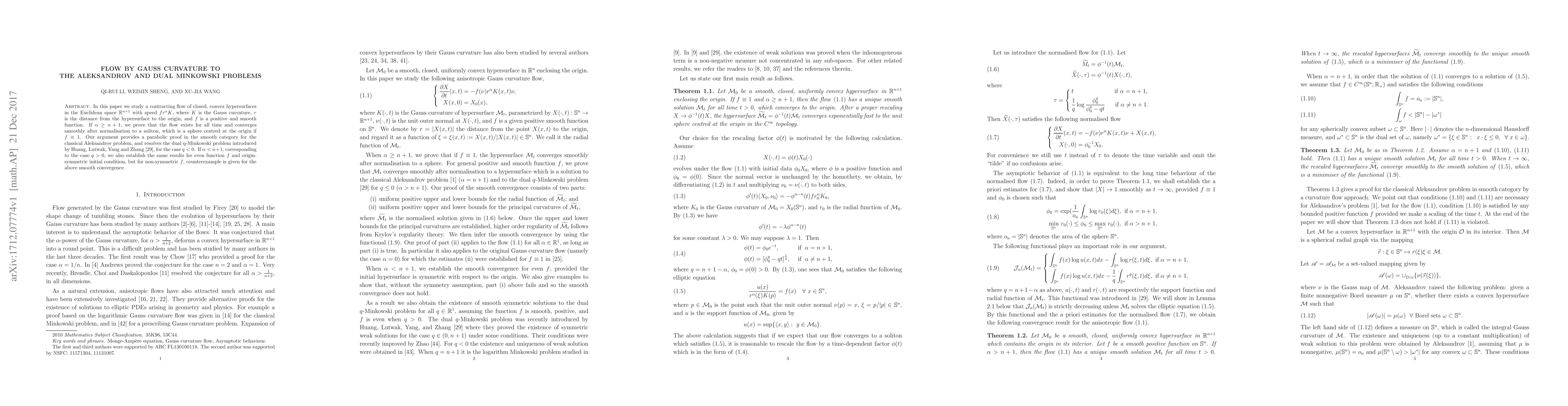 This paper explores a flow of convex shapes in Euclidean space, driven by Gauss curvature and distance from the origin, with specific conditions on a function f. For u2264n+1, it proves smooth convergence to a sphere under certain circumstances, providing a parabolic proof for the Aleksandrov problem and resolving the dual Minkowski problem for q<0. For >n+1, it confirms similar results under specific constraints, but presents counterexamples for others.