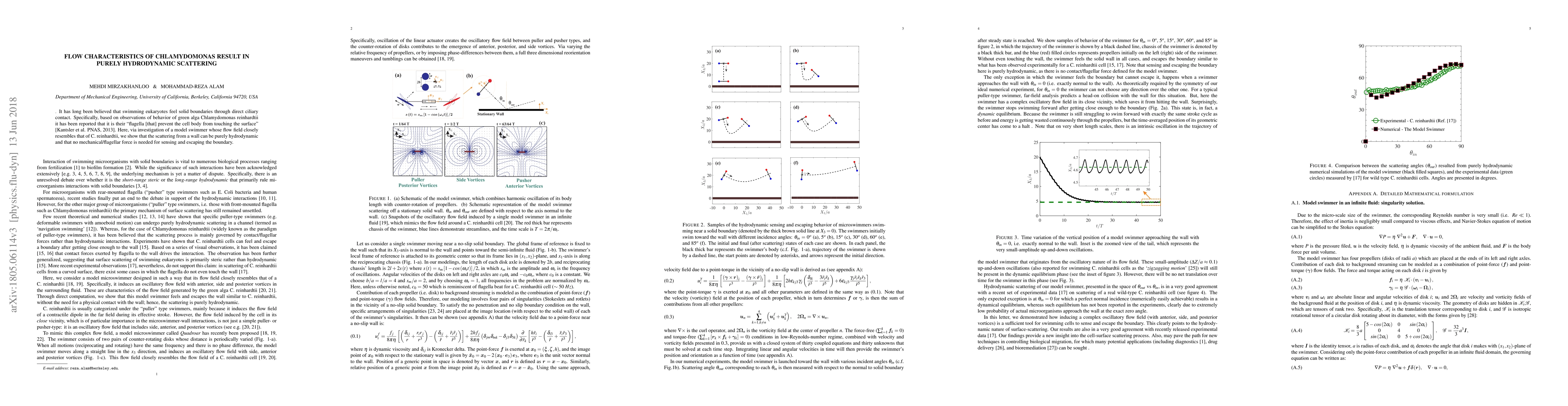 This study demonstrates that the green alga Chlamydomonas reinhardtii can sense and avoid solid boundaries purely through hydrodynamic scattering, without requiring direct ciliary contact, based on the flow characteristics of a model swimmer. These findings challenge the traditional view that boundary sensing relies on mechanical forces from flagella.