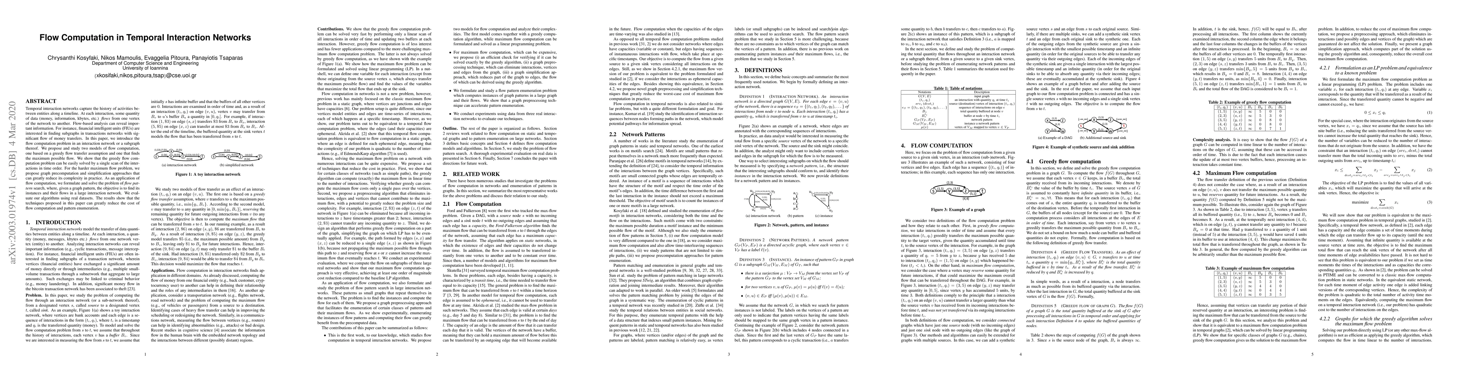 The paper introduces a flow computation problem in temporal interaction networks and proposes two models: one based on greedy flow transfer and another finding maximum possible flow, with applications including financial analysis and pattern search.