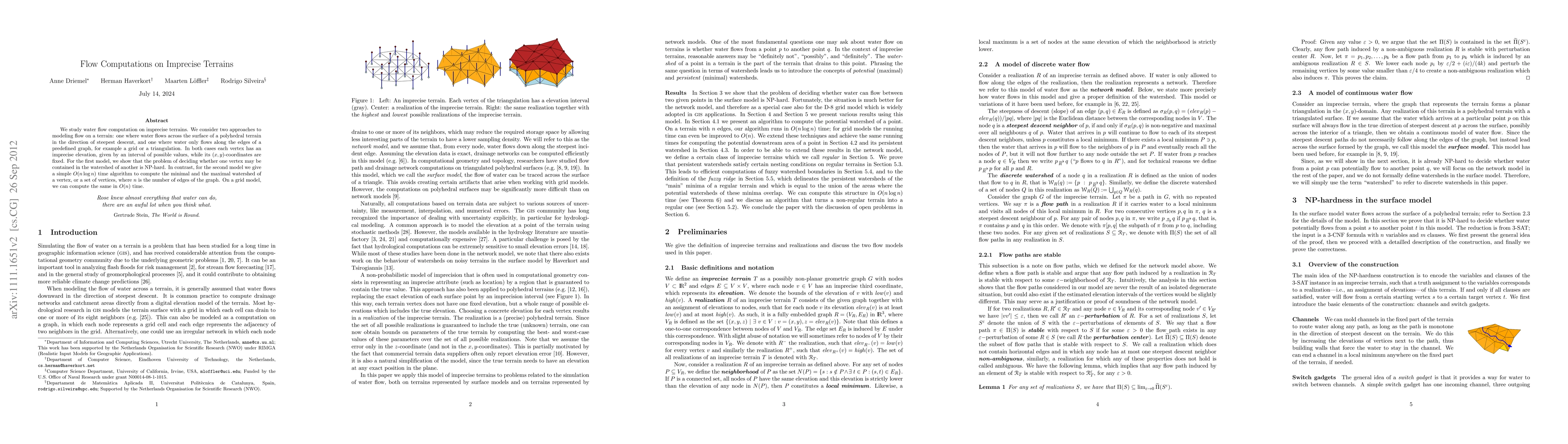 Researchers studied water flow on imprecise terrains, finding that one method is NP-hard to solve, while another yields an efficient algorithm for computing watershed boundaries.