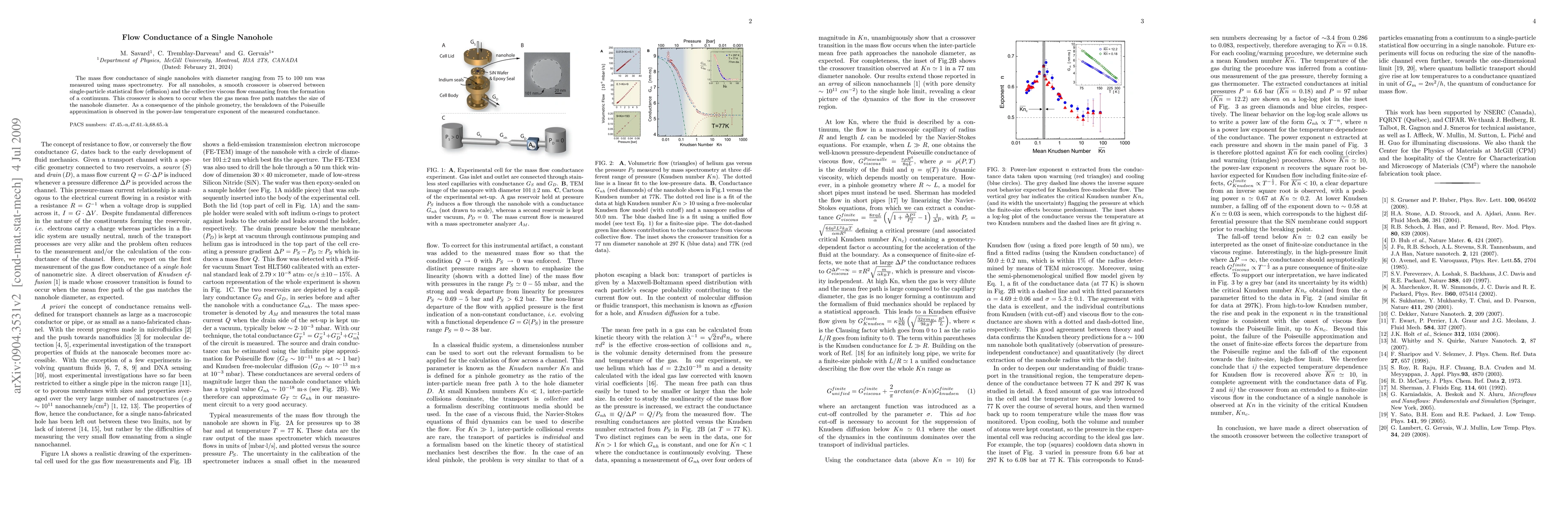 The mass flow conductance of single nanoholes with diameter ranging from 75 to 100 nm was measured using mass spectrometry. For all nanoholes, a smooth crossover is observed between single-particle statistical flow (effusion) and the collective viscous flow emanating from the formation of a continuum. This crossover is shown to occur when the gas mean free path matches the size of the nanohole diameter. As a consequence of the pinhole geometry, the breakdown of the Poiseuille approximation is observed in the power-law temperature exponent of the measured conductance.