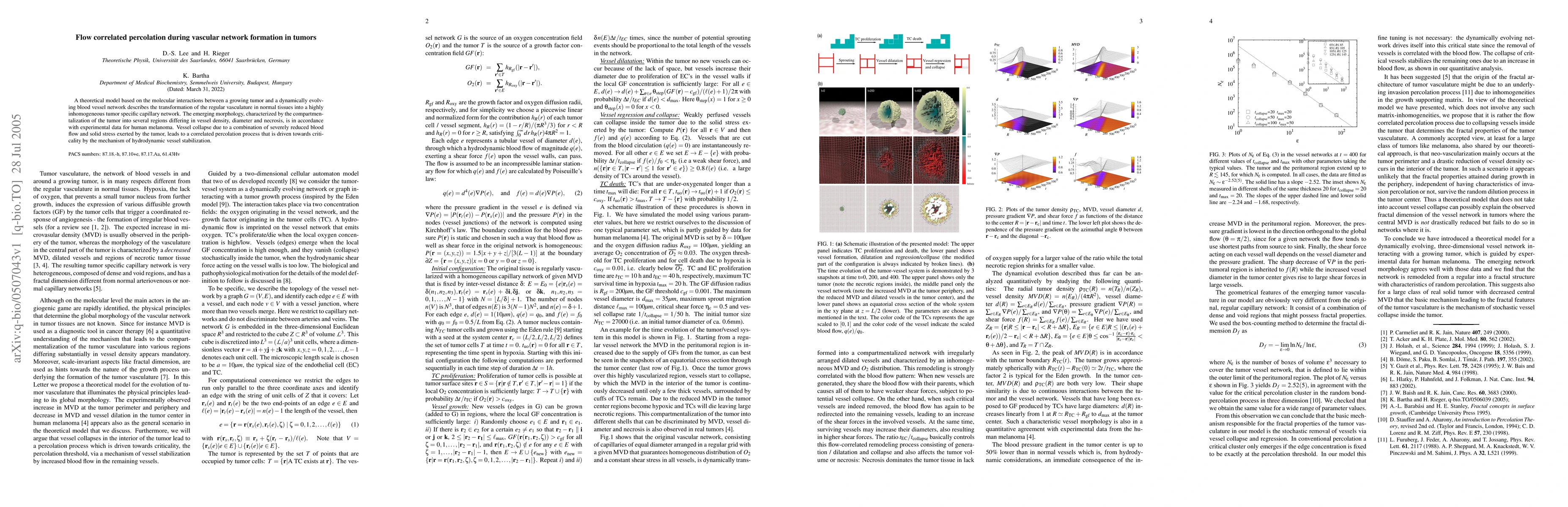 A theoretical model based on the molecular interactions between a growing tumor and a dynamically evolving blood vessel network describes the transformation of the regular vasculature in normal tissues into a highly inhomogeneous tumor specific capillary network. The emerging morphology, characterized by the compartmentalization of the tumor into several regions differing in vessel density, diameter and necrosis, is in accordance with experimental data for human melanoma. Vessel collapse due to a combination of severely reduced blood flow and solid stress exerted by the tumor, leads to a correlated percolation process that is driven towards criticality by the mechanism of hydrodynamic vessel stabilization.