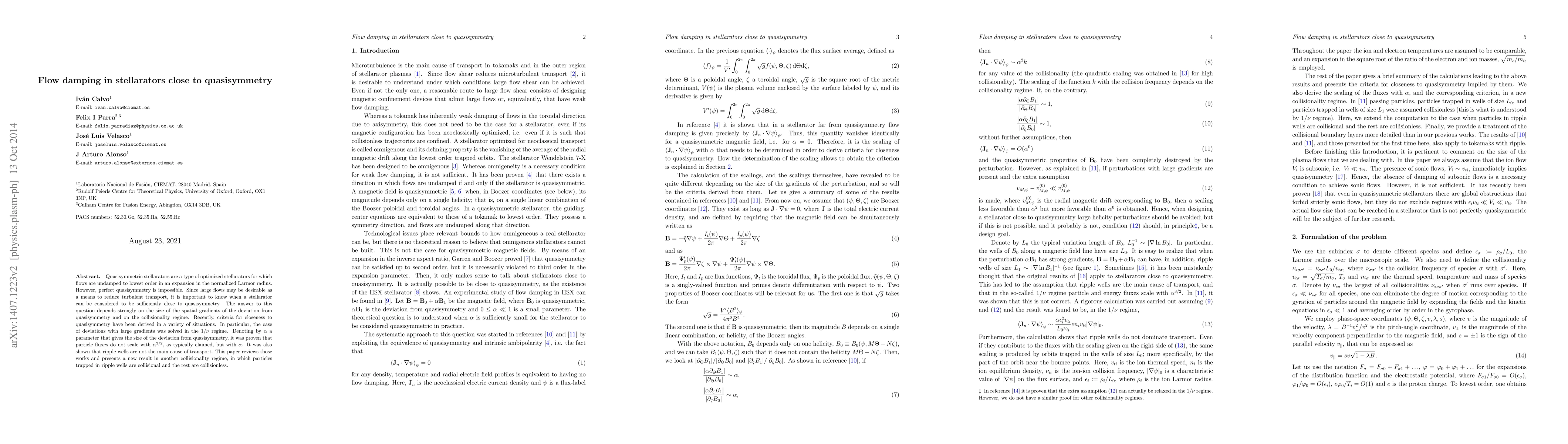 This paper reviews recent findings on flow damping in quasisymmetric stellarators, showing that large flows can reduce turbulent transport. It demonstrates that particle fluxes scale with the deviation parameter $\alpha$ rather than $\alpha^{3/2}$, and introduces a new result for a collisionality regime where trapped particles in ripple wells are collisional while others remain collisionless.