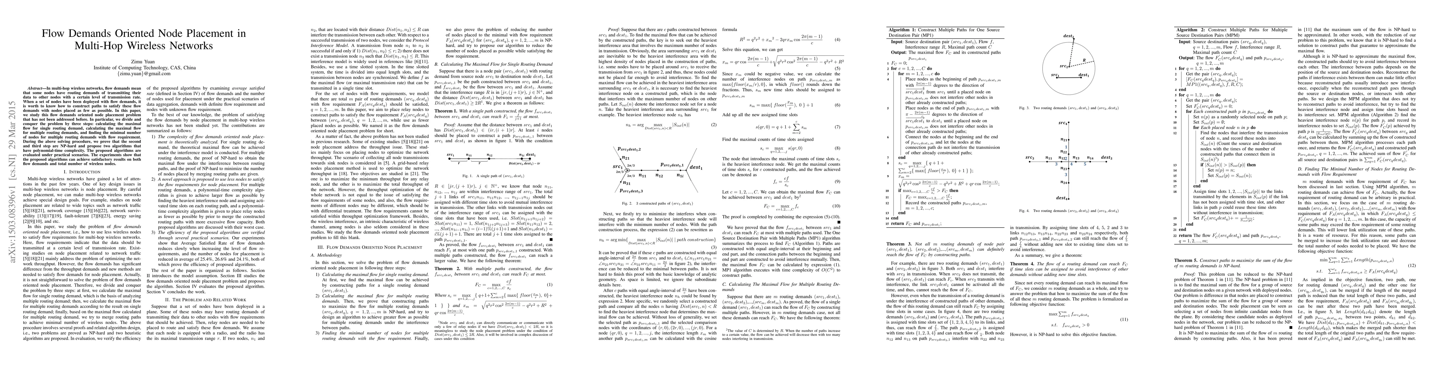 This paper addresses the novel problem of optimal node placement in multi-hop wireless networks to meet specific flow demands with minimal node usage. It proposes algorithms to solve the NP-hard problem of maximizing flow for multiple demands and demonstrates their effectiveness through practical evaluations.