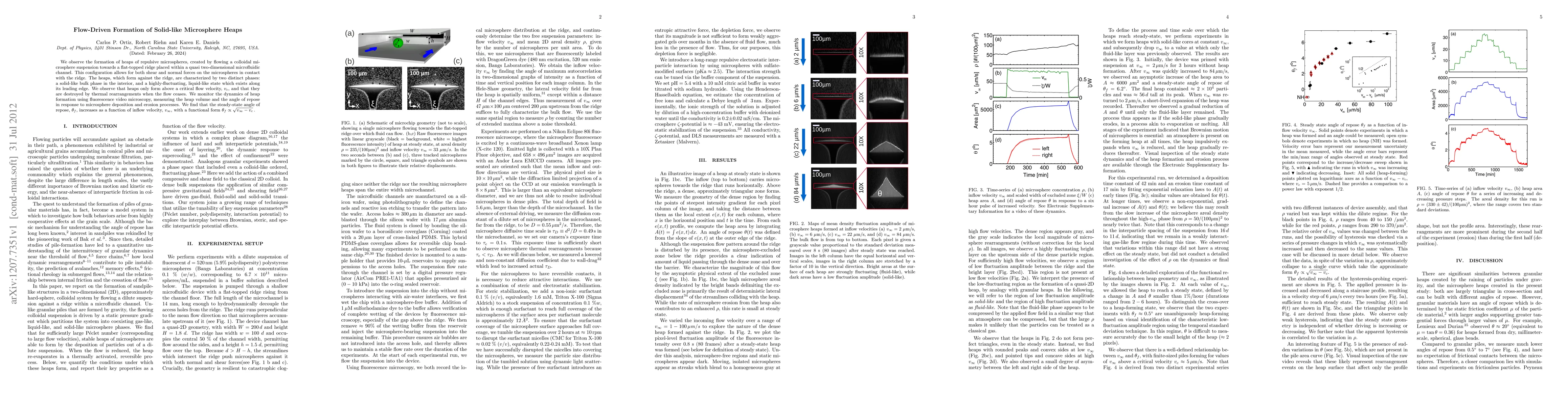 We observe the formation of heaps of repulsive microspheres, created by flowing a colloidal microsphere suspension towards a flat-topped ridge placed within a quasi two-dimensional microfluidic channel. This configuration allows for both shear and normal forces on the microspheres in contact with the ridge. The heaps, which form against the ridge, are characterized by two distinct phases: a solid-like bulk phase in the interior, and a highly-fluctuating, liquid-like state which exists along its leading edge. We observe that heaps only form above a critical flow velocity, (v_c), and that they are destroyed by thermal rearrangements when the flow ceases. We monitor the dynamics of heap formation using fluorescence video microscopy, measuring the heap volume and the angle of repose in response to microsphere deposition and erosion processes. We find that the steady-state angle of repose, (\theta_f), increases as a function of inflow velocity, (v_\infty), with a functional form (\theta_f \propto \sqrt{v_\infty - v_c}).
