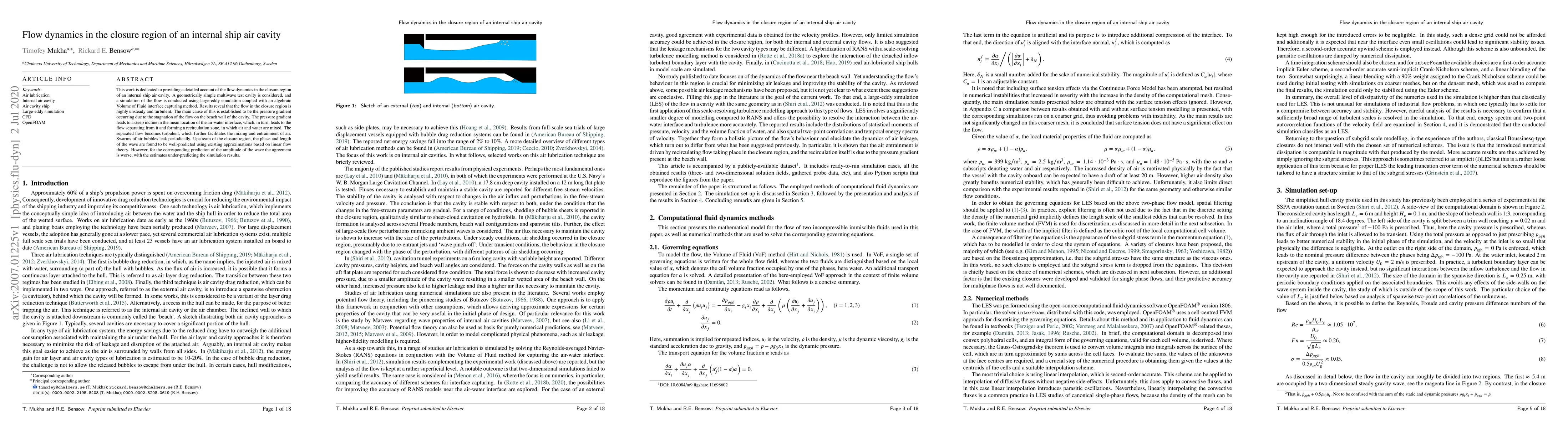 The flow dynamics in an internal ship air cavity show highly unsteady and turbulent behavior due to pressure gradients, leading to separation and mixing of air and water; existing linear flow theory approximations predict wave phase and length well but under-predict amplitude.