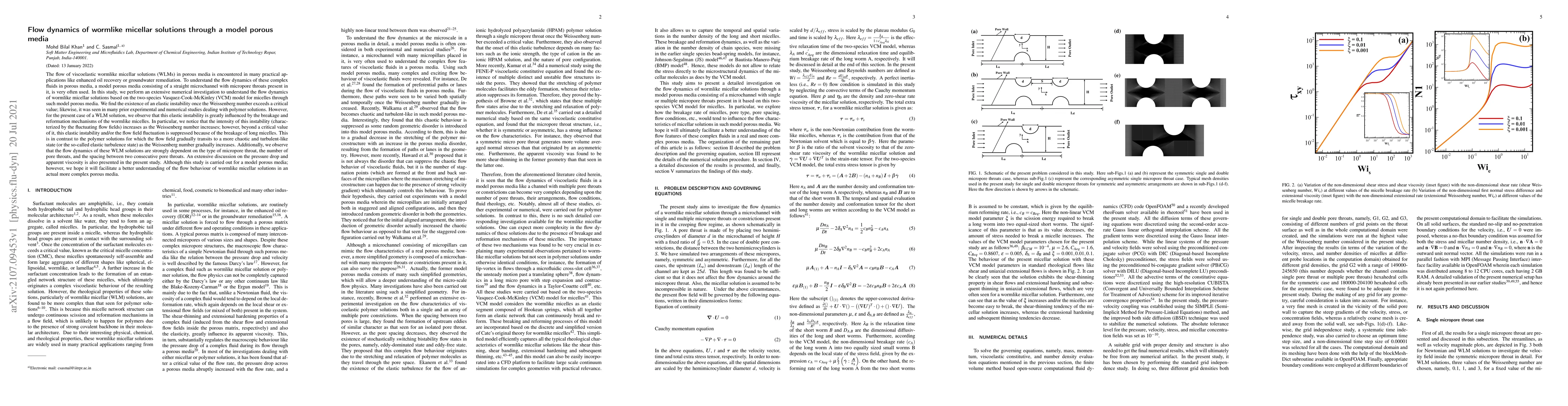 This study investigates the flow dynamics of viscoelastic wormlike micellar solutions through a model porous media using a numerical approach based on the Vasquez-Cook-McKinley model. It finds that while elastic instability is present, the breakage of micelles suppresses the instability at high Weissenberg numbers, contrasting with polymer solutions' transition to elastic turbulence. The flow dynamics are also shown to be significantly influenced by the micropore throat characteristics.