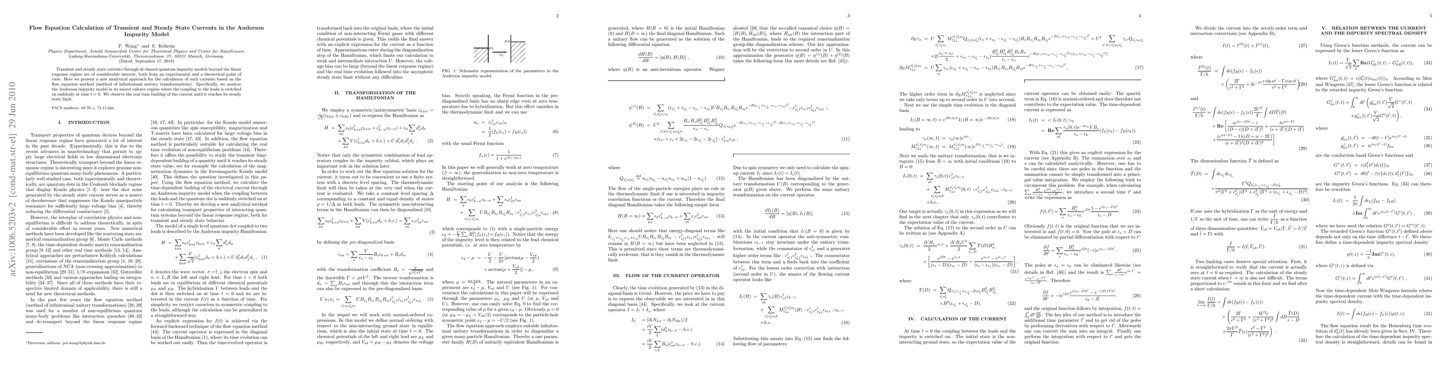 This paper presents a new analytical method using flow equations to calculate transient and steady state currents in the Anderson impurity model beyond linear response. The study focuses on the mixed valence regime and the sudden onset of coupling to leads, observing the real-time buildup of current.