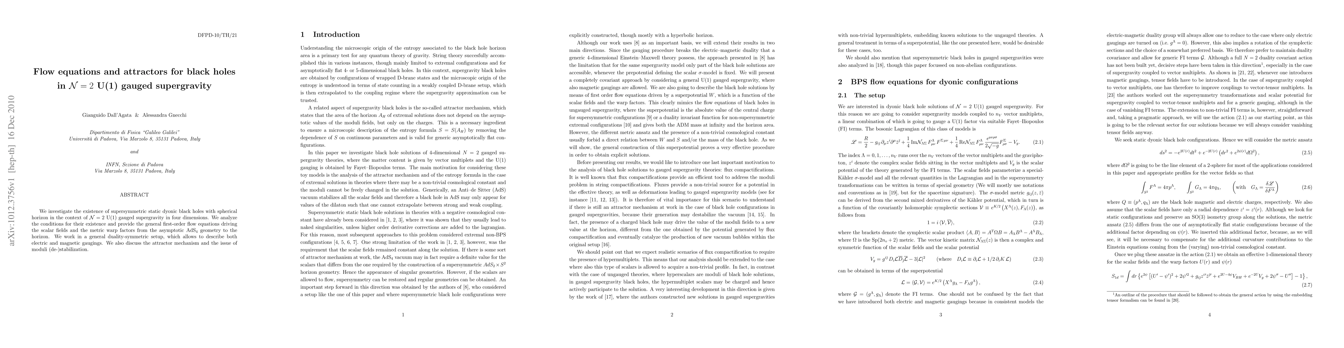 This paper explores supersymmetric static dyonic black holes in N=2 U(1) gauged supergravity, deriving first-order flow equations for scalar fields and metric warp factors. It also examines the attractor mechanism and the stabilization of moduli in this context.