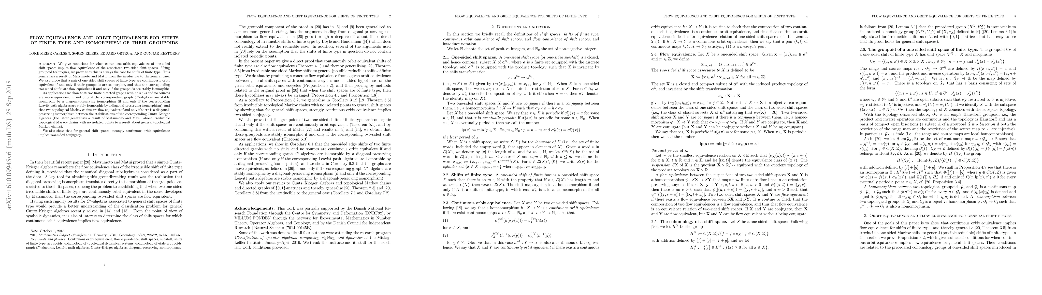 We give conditions for when continuous orbit equivalence of one-sided shift spaces implies flow equivalence of the associated two-sided shift spaces. Using groupoid techniques, we prove that this is always the case for shifts of finite type. This generalises a result of Matsumoto and Matui from the irreducible to the general case. We also prove that a pair of one-sided shift spaces of finite type are continuously orbit equivalent if and only if their groupoids are isomorphic, and that the corresponding two-sided shifts are flow equivalent if and only if the groupoids are stably isomorphic. As applications we show that two finite directed graphs with no sinks and no sources are move equivalent if and only if the corresponding graph $C^*$-algebras are stably isomorphic by a diagonal-preserving isomorphism (if and only if the corresponding Leavitt path algebras are stably isomorphic by a diagonal-preserving isomorphism), and that two topological Markov chains are flow equivalent if and only if there is a diagonal-preserving isomorphism between the stabilisations of the corresponding Cuntz-Krieger algebras (the latter generalises a result of Matsumoto and Matui about irreducible topological Markov chains to a result about general topological Markov chains). We also show that for general shift spaces, strongly continuous orbit equivalence implies two-sided conjugacy.