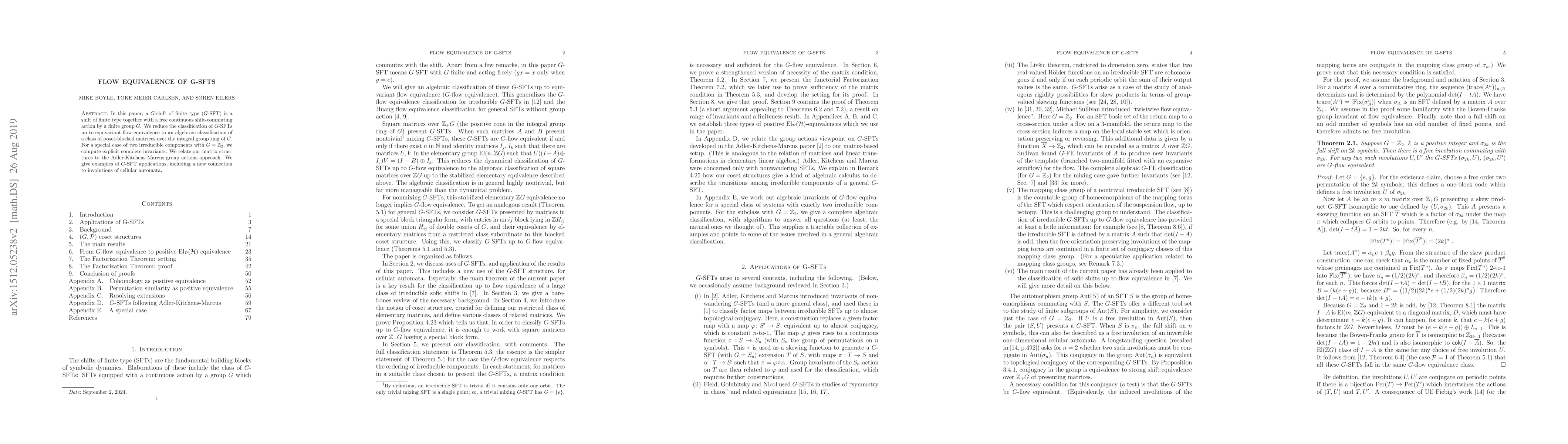In this paper, a G-shift of finite type (G-SFT) is a shift of finite type together with a free continuous shift-commuting action by a finite group G. We reduce the classification of G-SFTs up to equivariant flow equivalence to an algebraic classification of a class of poset-blocked matrices over the integral group ring of G. For a special case of two irreducible components with G$=\mathbb Z_2$, we compute explicit complete invariants. We relate our matrix structures to the Adler-Kitchens-Marcus group actions approach. We give examples of G-SFT applications, including a new connection to involutions of cellular automata.