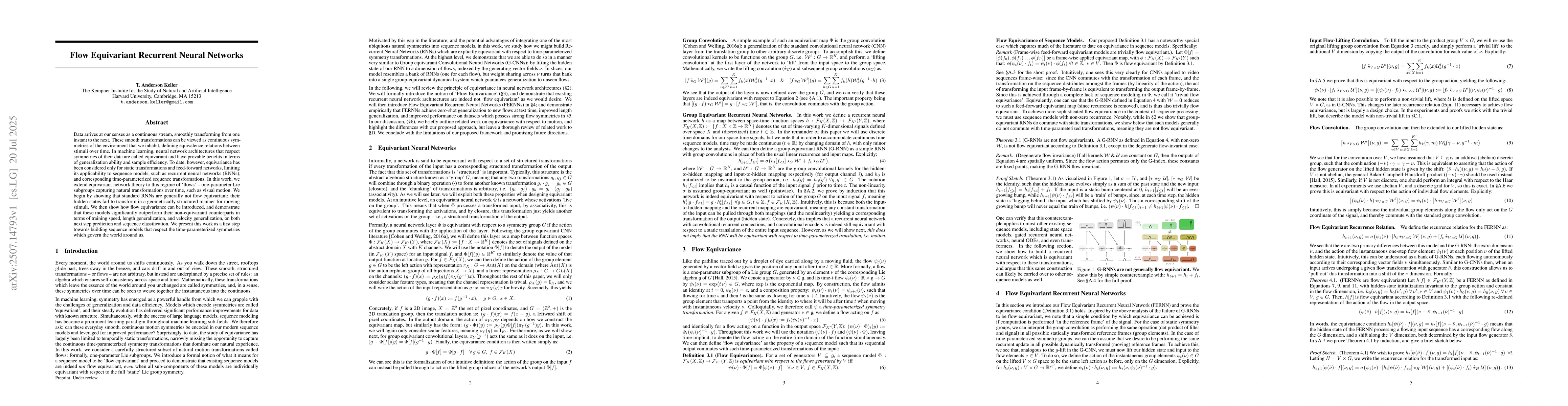 The research extends equivariant network theory to sequence models, specifically recurrent neural networks (RNNs), introducing flow equivariance for time-parameterized symmetries like visual motion.